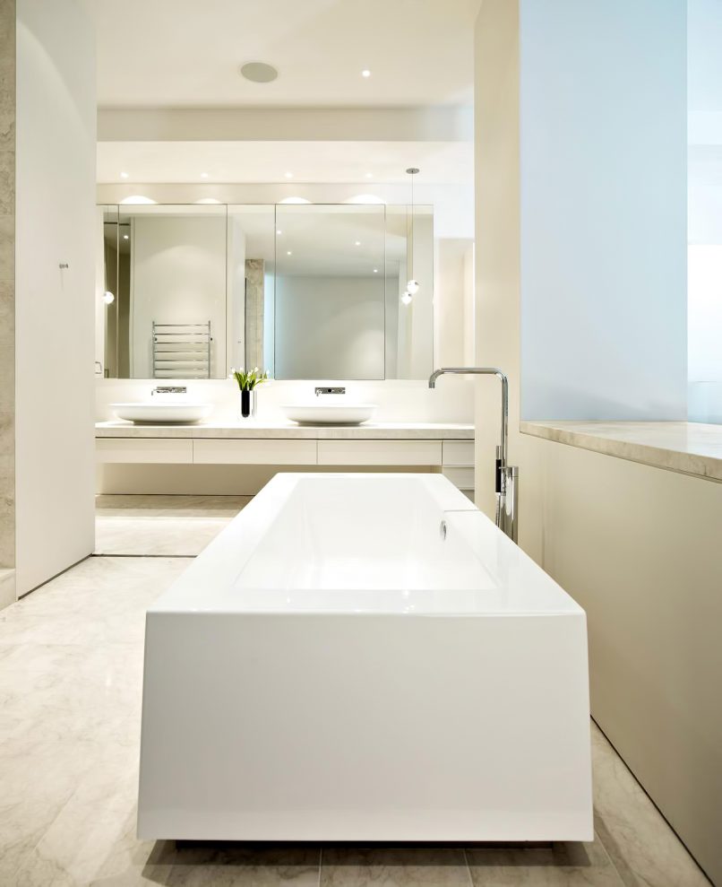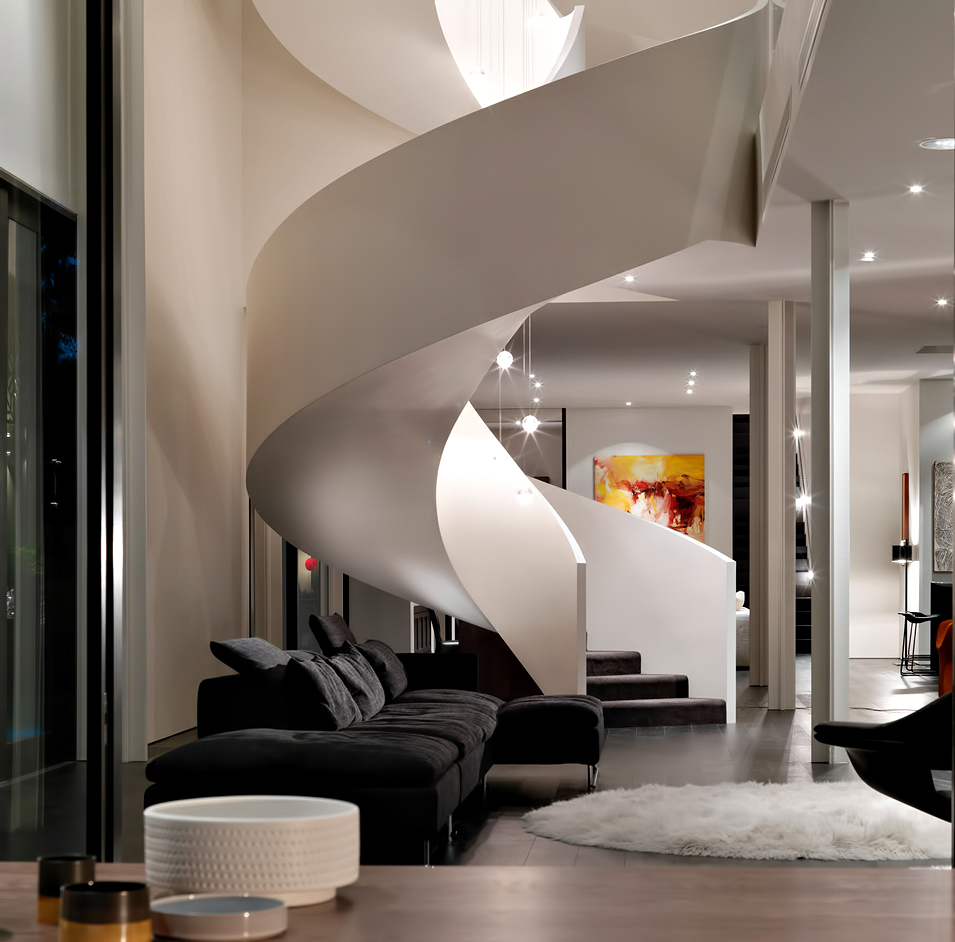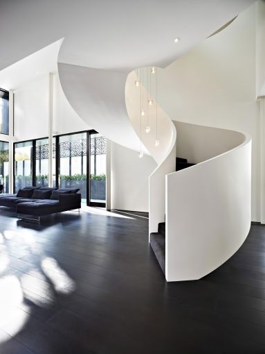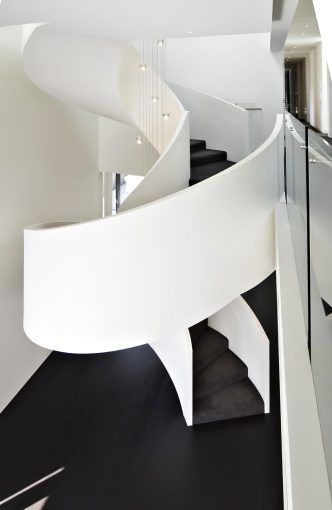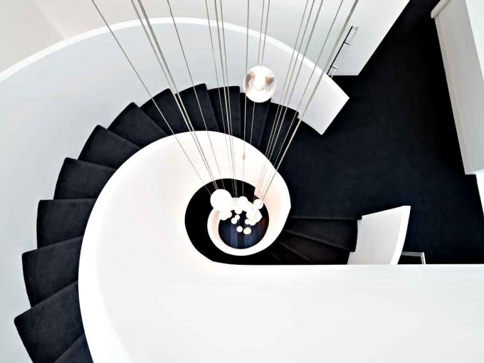 Marrying purity of form with function, the captivating spiral staircase linking the ground floor to the first and second levels, provides an absolutely striking central sculptural element that contrasts with the cubic character of the interior.