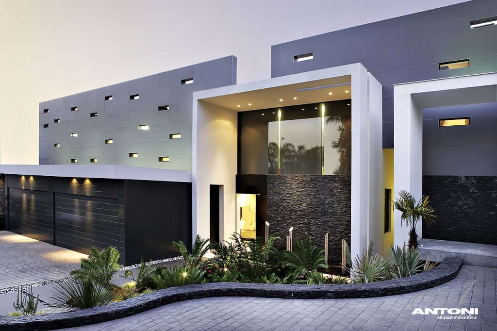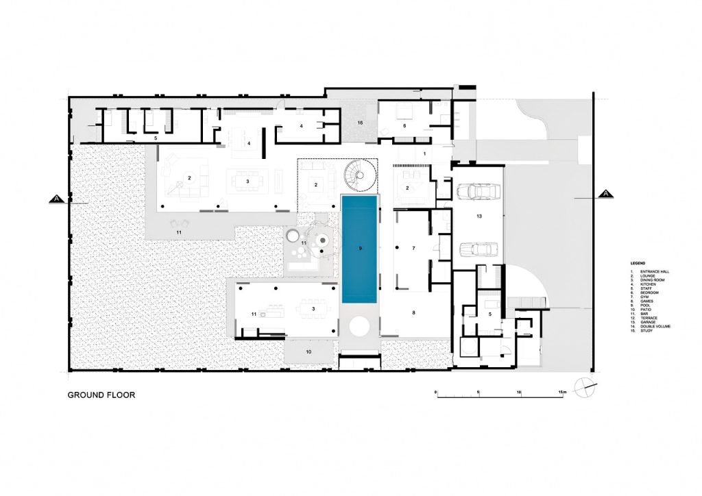 Situated on a gentle slope surrounded by trees in the Johannesburg suburb of Houghton Estates, this u-shaped home is organized around an inner courtyard, allowing privacy for the pool and easy access to the living spaces. An impeccably crafted fully curved staircase cascades between the upper and lower levels with glass railing, creating a focal point of luxurious distinction within the geometric equilibrium of the cubed structure.