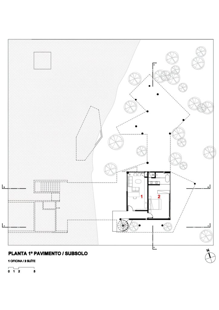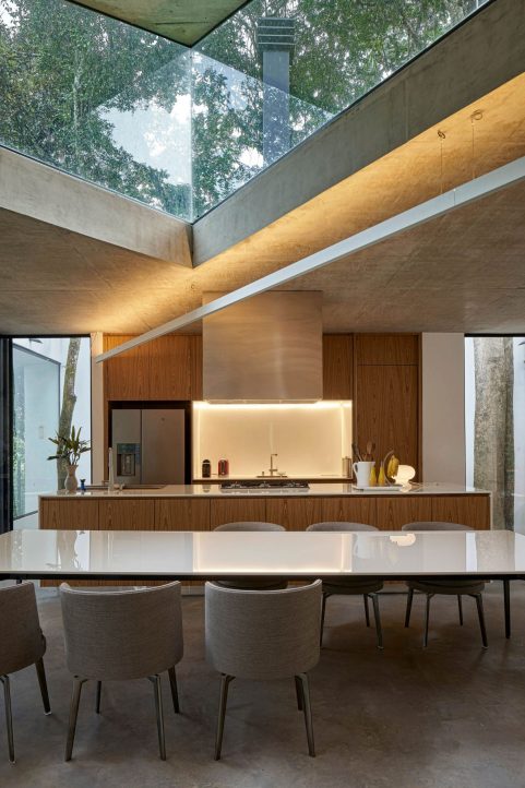Açucena House emerges as a striking tableau of white against the lush green backdrop. A whimsical dance of black pillars, mirroring the sinuous forms of tree trunks, imbues the structure with an ethereal quality. The residence seemingly levitates, its fluid layout organically determined by the program’s interplay with the arboreal tapestry. Openings and folds in the structure’s form artfully frame vistas of the treetops, sculpting a dynamic silhouette. Açucena House is a symphony of nature and art, where the purity of white petals unfurls amidst the wild expanse, offering an architectural revelation in the heart of the forest.