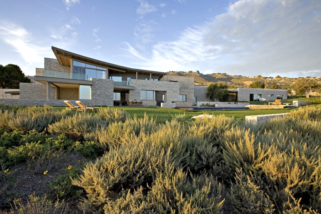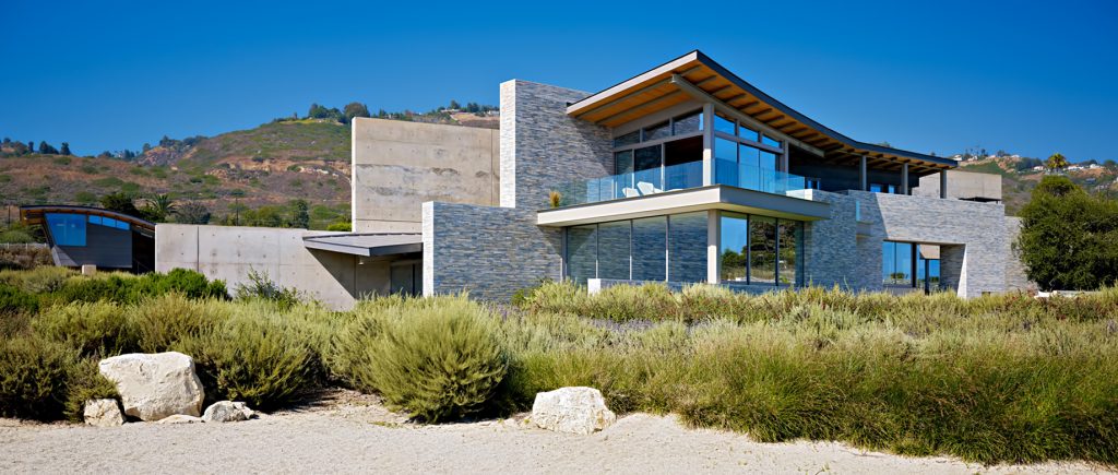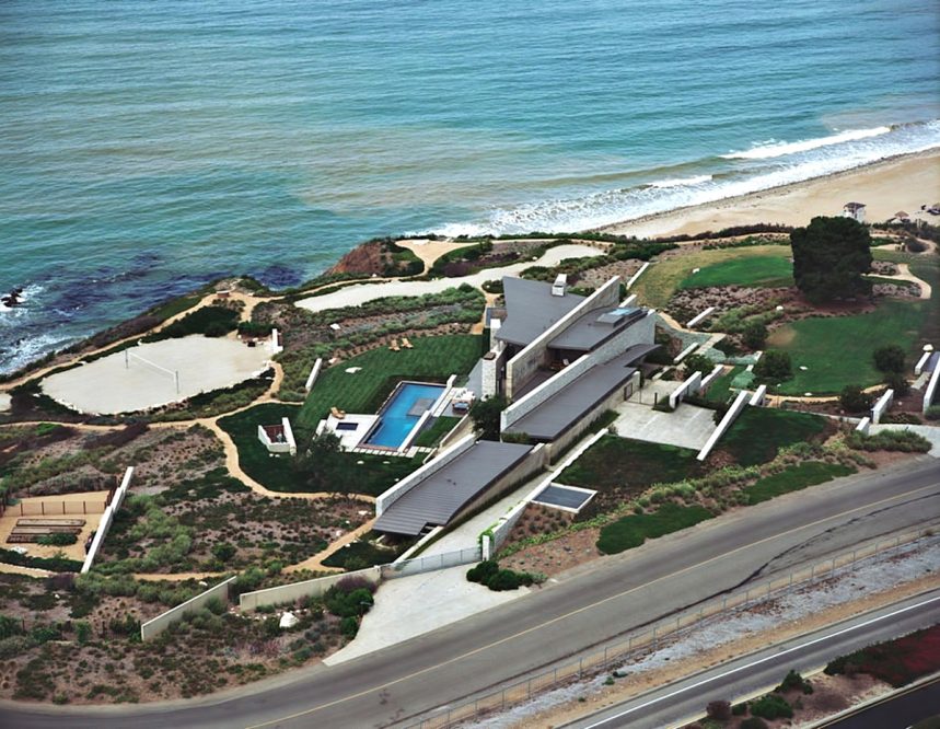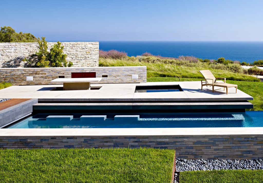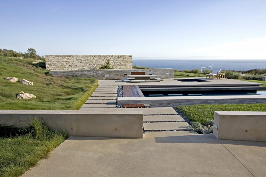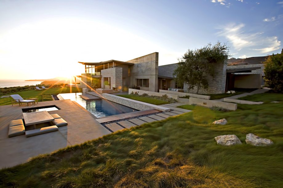 A landmark oceanfront estate on the California coastline, the Altamira residence was architecturally inspired by the natural elements and topography of its 13.2-acre site overlooking the Pacific Ocean. Designed to complement casual indoor/outdoor living, a modern and clean structural narrative encompasses four separate buildings on the property with the main house, study, guest house, and garage all constructed with steel beams, stone and concrete to create large voluminous realms broadly segregated with small intimate spaces.