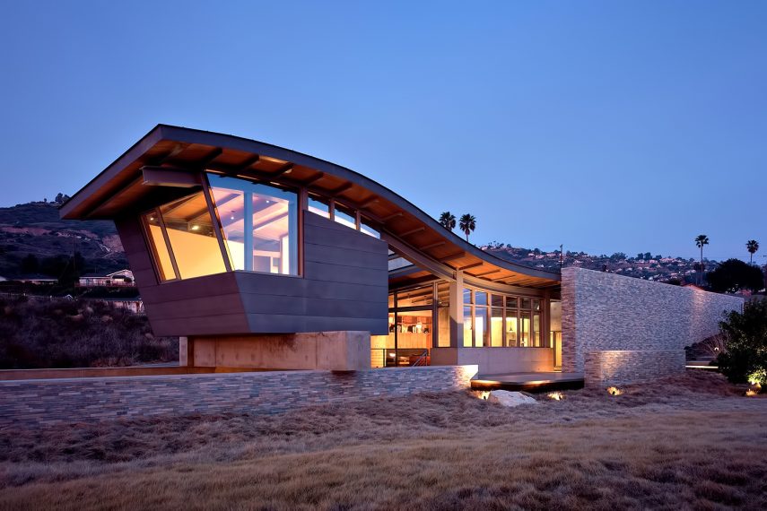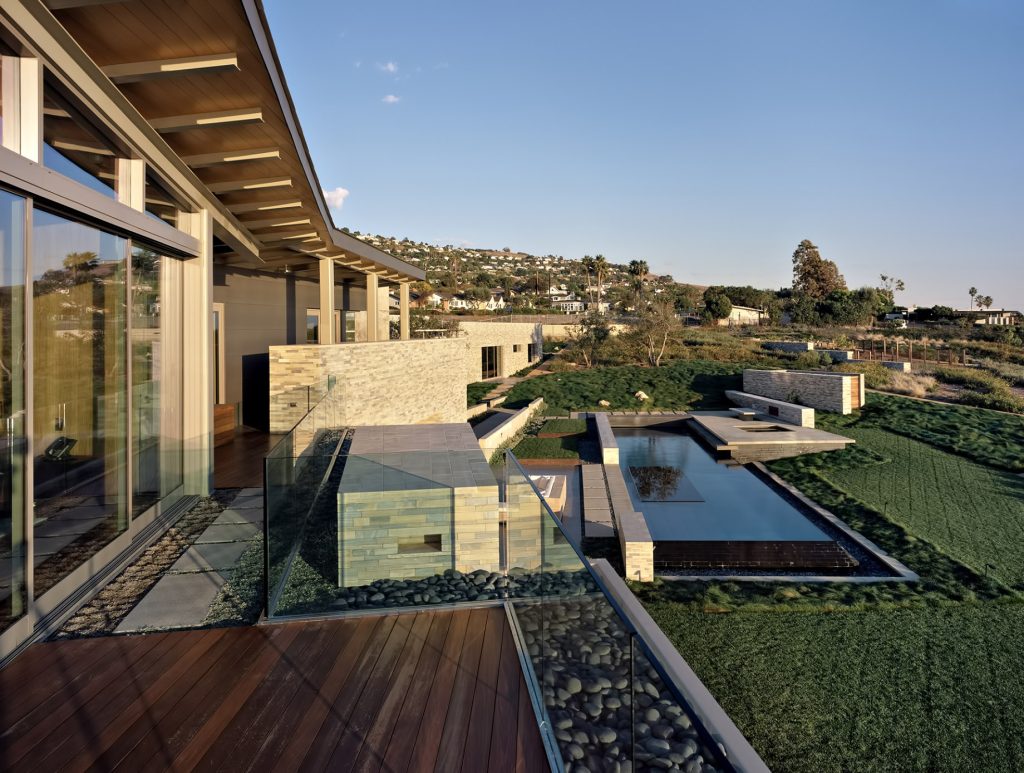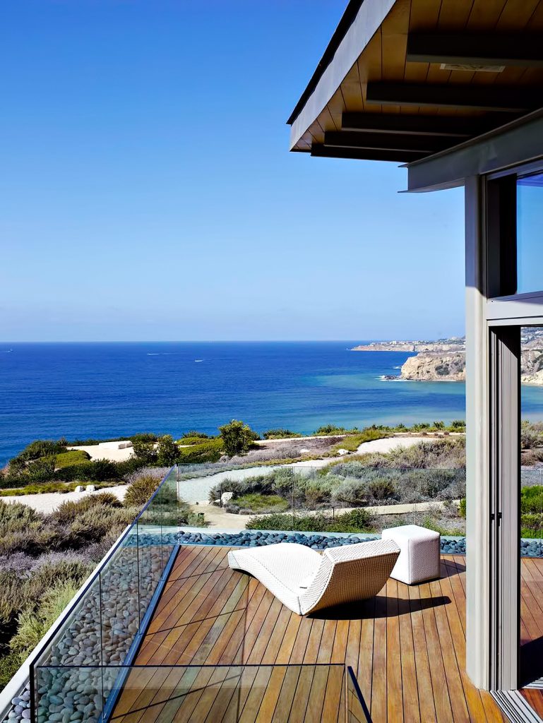 Capturing a series of views that majestically frame the Pacific Ocean out to Catalina Island and nearby landmarks like Inspiration Point, this extraordinary luxury estate was cut into the terrain of its location to preserve ocean views for the surrounding neighborhoods. Viewed from the street, the structures of the residence are nearly not there, almost as if it belongs to the land itself.