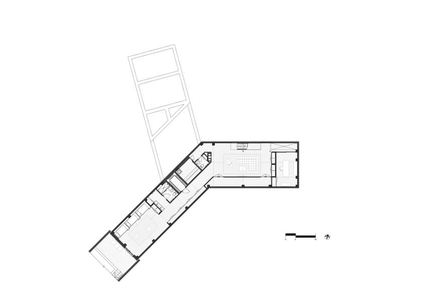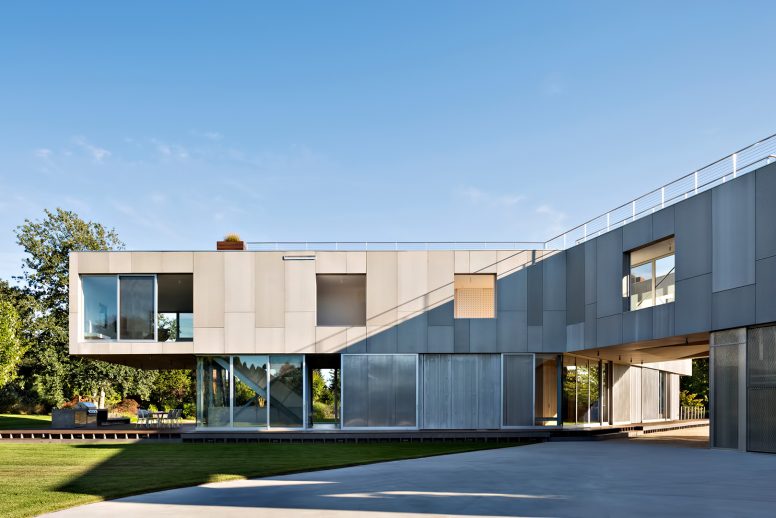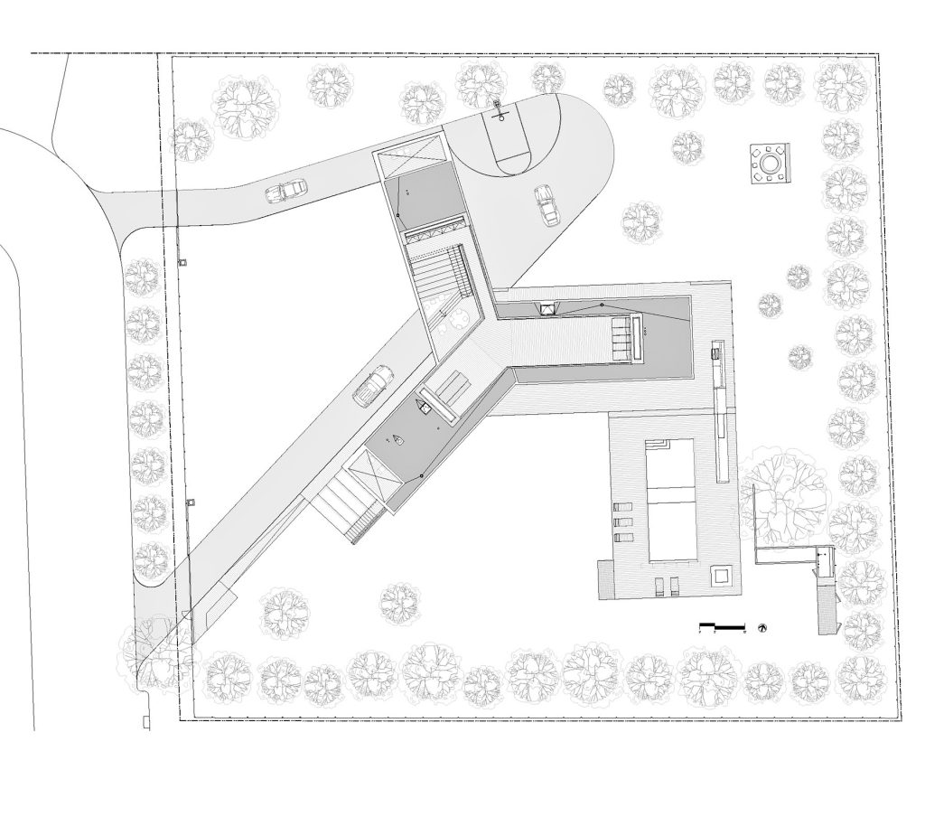 Dividing a typical suburban lot into three yards, the house has three yards with each yard programmed according to its activity: a recreation yard toward the south with a pool, a garden yard facing west and an auto yard for cars, motorcycles and go-karts. Framing each yard, the house becomes a three-spoke division between these yards. At the ground floor the three spokes divide into a living wing, kitchen wing and garage wing; whereas the second floor is divided into a guest wing, a children’s wing and parent’s wing.