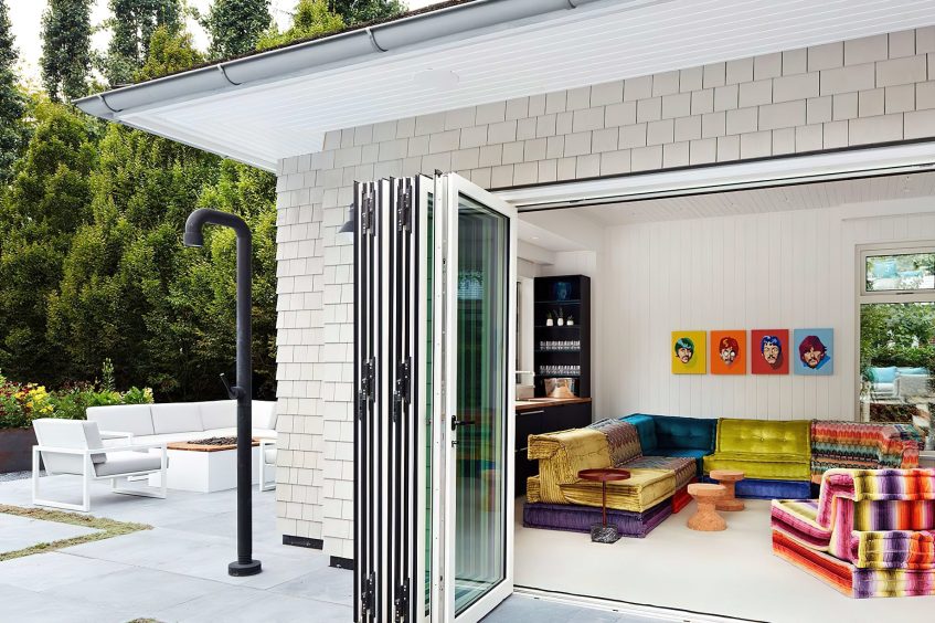 This spectacular modern farmhouse luxury remodel features 25 feet of folding doors to integrate to its exterior. Outdoor furniture by Kettal and Royal Bottania include a 20-foot pavilion for dining al fresco and three separate outdoor seating areas all with custom fire pits and large umbrellas for sun and rain protection. A new Boffi kitchen complemented by Miele, Wolf and Sub Zero appliances. Shower surrounds in the washrooms include waterproof art panels by Alex Terco Designs.