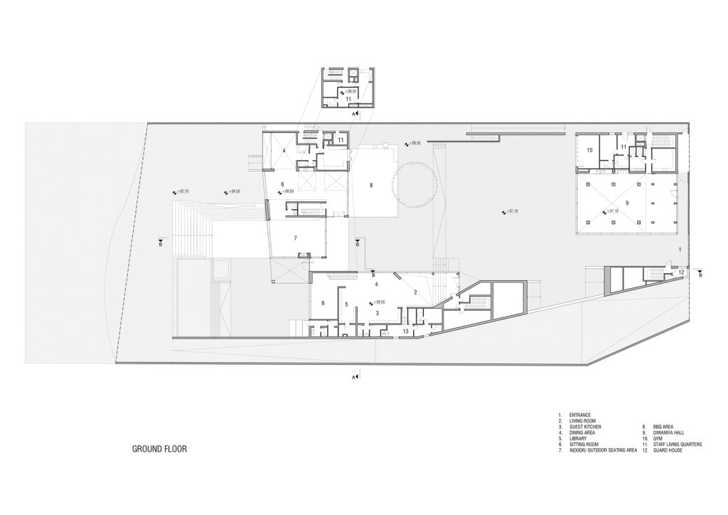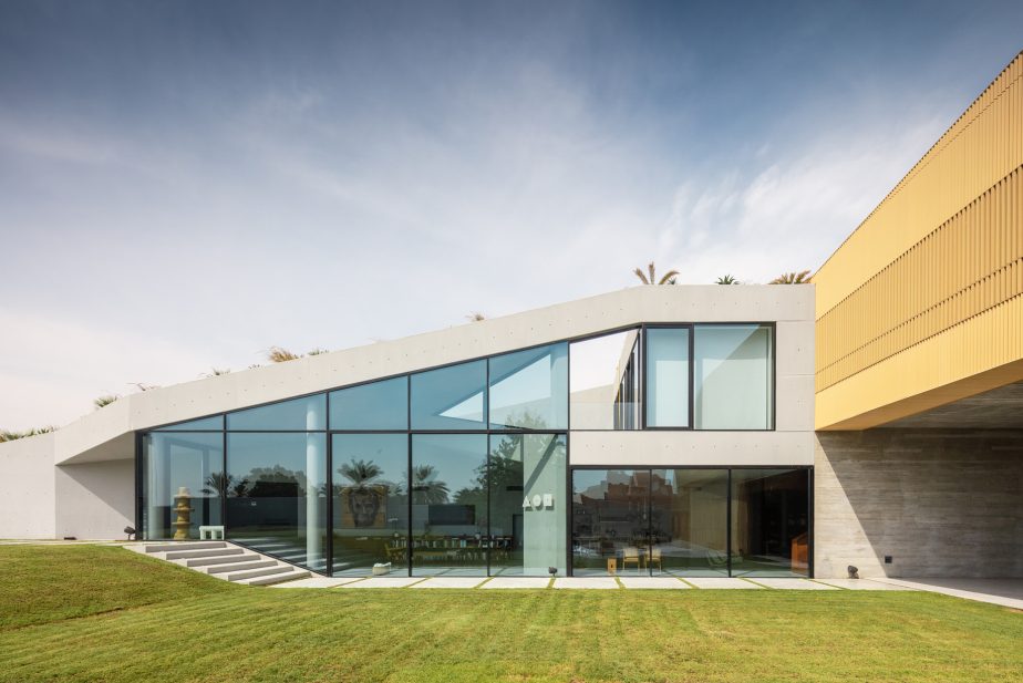 In addition to the main family house, the residence includes a distinct guesthouse and a diwaniya, catering to flexible living and entertaining needs. The guesthouse, positioned between two landscapes, features living quarters with an open kitchen and library on the ground floor, and a master suite with three en-suite guest bedrooms on the first floor. A unique “secret corridor” within a wood-clad library connects the guesthouse to the children’s playroom in the barn, emphasizing the sense of interconnection throughout the property. The diwaniya, a traditional gathering space, includes a main hall open on three sides to the landscape, with living quarters, a kitchen, a guest bathroom, and a gym on the ground floor, and additional sleeping quarters on the first floor.