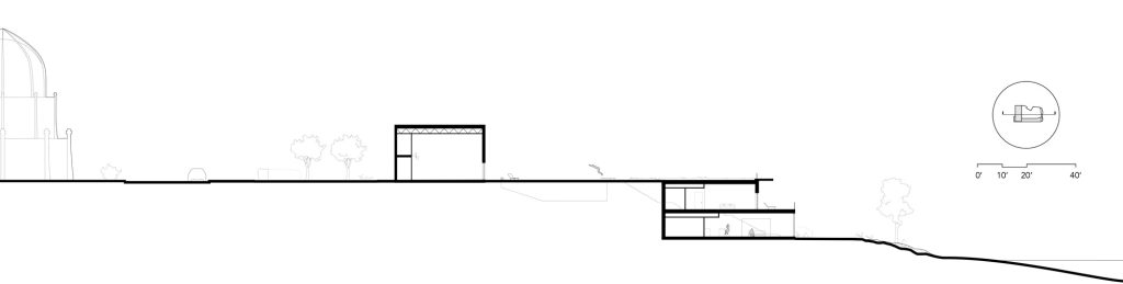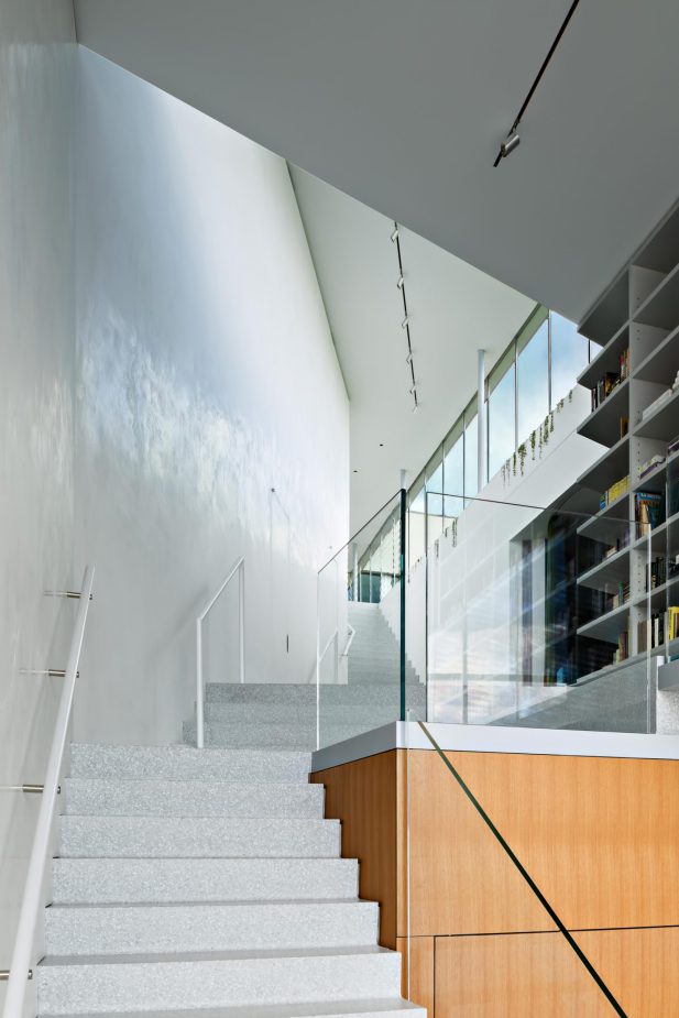 The house consists of four levels. A two-story structure, windowless on the street, contains the garage, a gym, and a guest suite. This faรงade is un-residential in scale, but acts as foil to the monument of the residence. Almost an inversion of its grand scale, the main house entry is located at the top of the stairs with the spaces of the house revealing themselves on the way down to the beach below. As one descends down the processional light filled stairway the house gives itself away, beneath the typical American suburban lawn above. The architecture creates an experience, where the whole is pieced together through oneโs mental landscape of moving down and through the house.