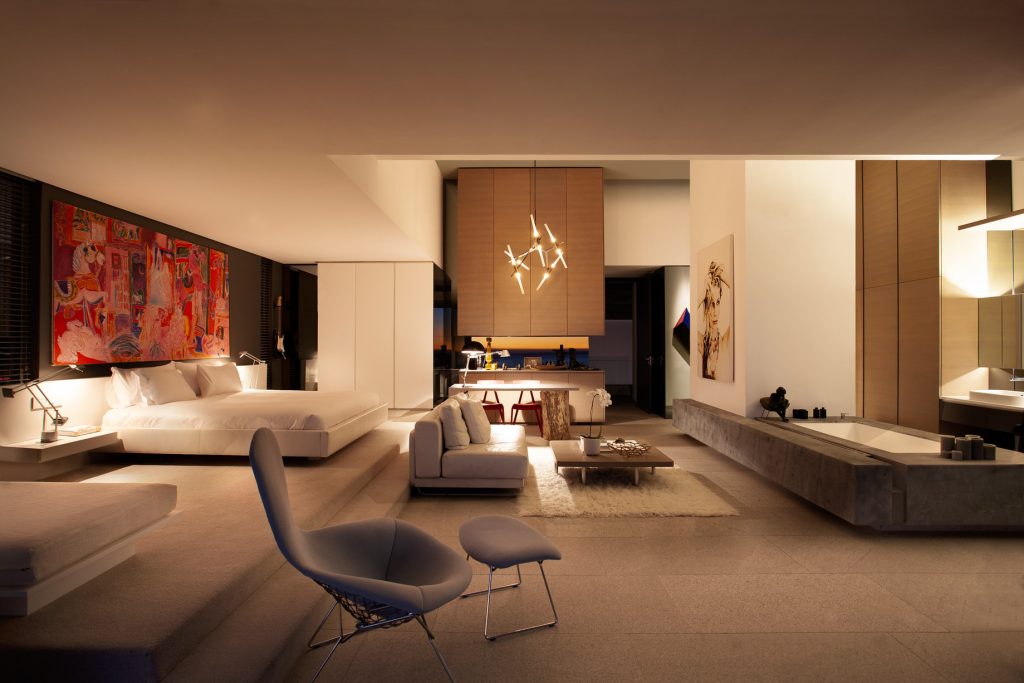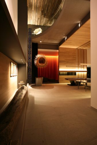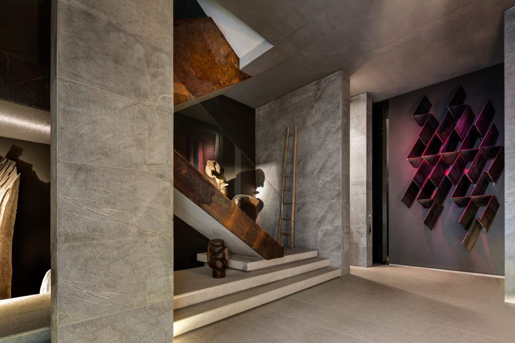 Beyond House is not only a luxurious living space but also a setting for a prized collection of contemporary South African art. The art is carefully curated to work with the architecture, blurring the lines between home and gallery. The entrance hall features a tapestry by Paul Blomkamp and a sculpture by Paul Edmunds, while the double volume entertainment area features an inhabitable sculpture by Porky Hefer. The African masks worked into the dark walls over the kitchen add an extra layer of cultural significance to the space with interiors purposely curated by ARRCC together with OKHA.