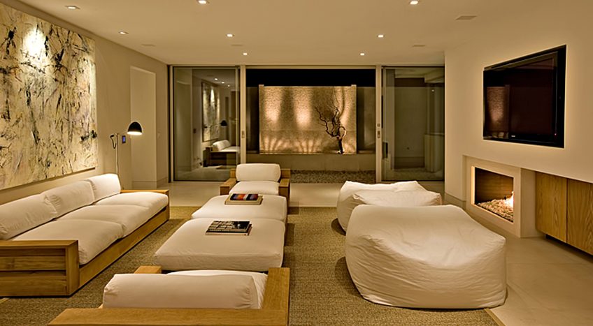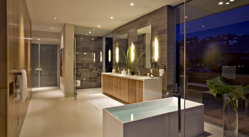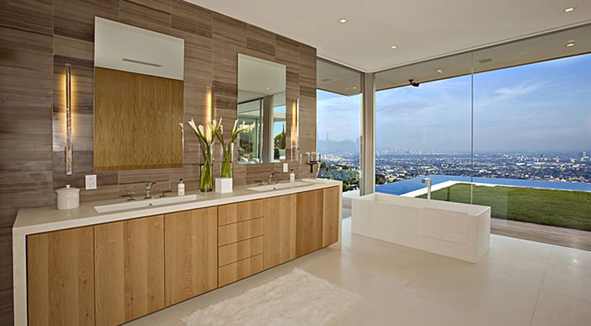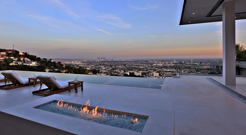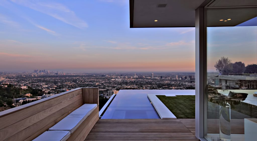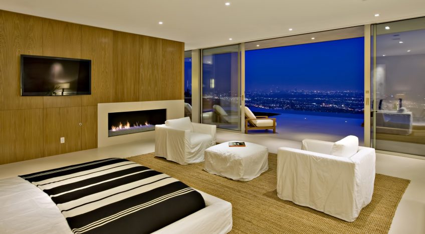 Evoking a true feeling of relaxation, a double edge infinity pool sits on the edge of the residence providing a totally luxurious vista view across from the striking 1,000 sq. ft. master suite. This trophy estate truly creates a unrivalled experience that visually connects the residence to the panoramic views of the Hollywood Hills delivering the personification of LA luxury living.ย