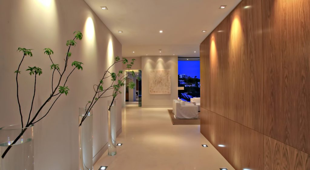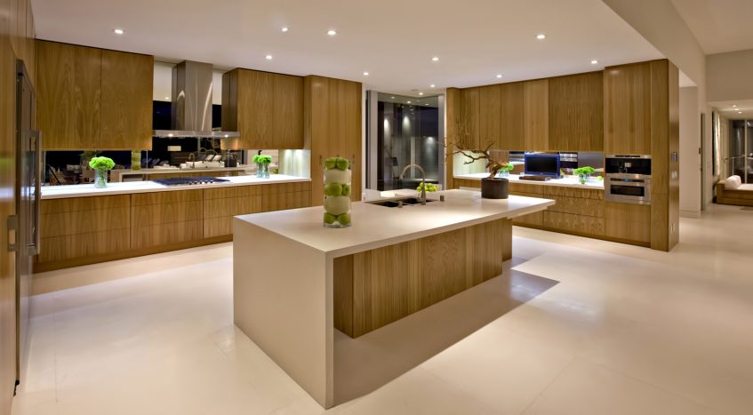 Slab limestone floors, brushed aluminum, stainless steel, light oak wood paneled walls and glass join in a soft modern pallet within this fully integrated one level smart home.
