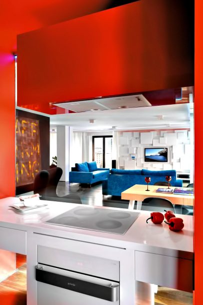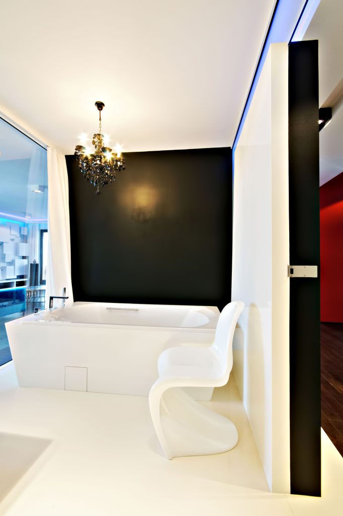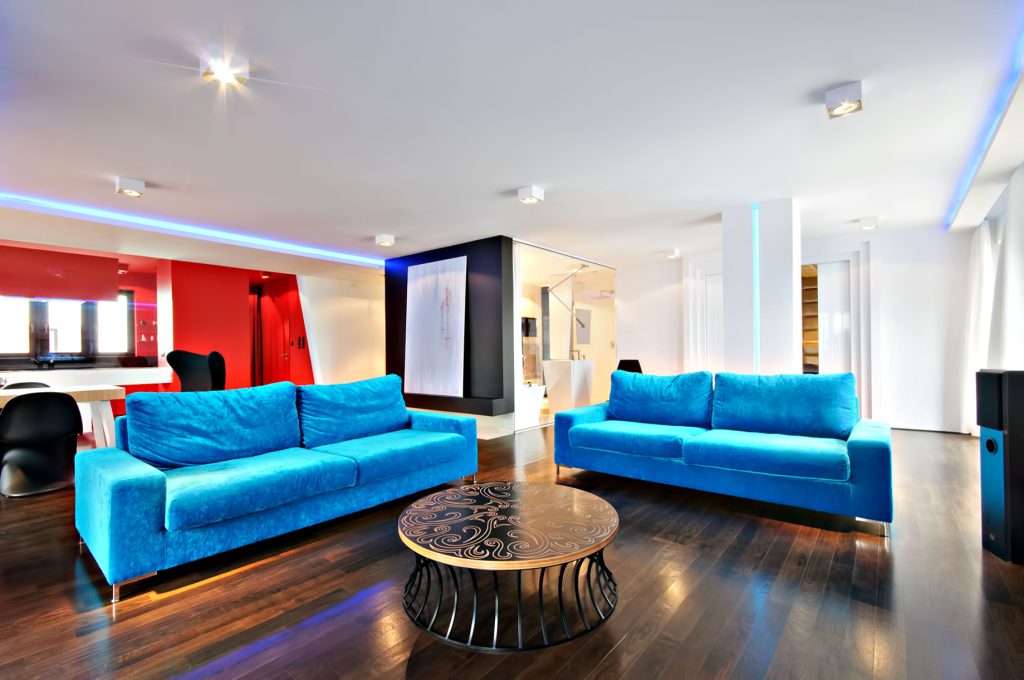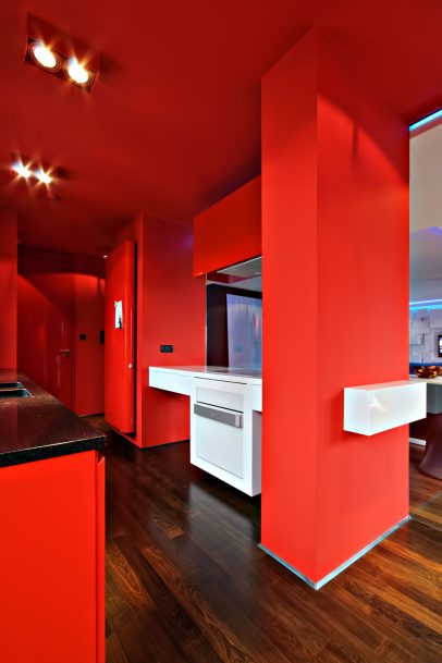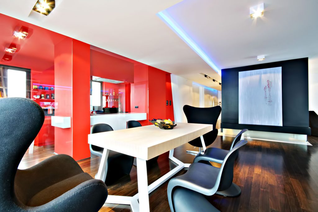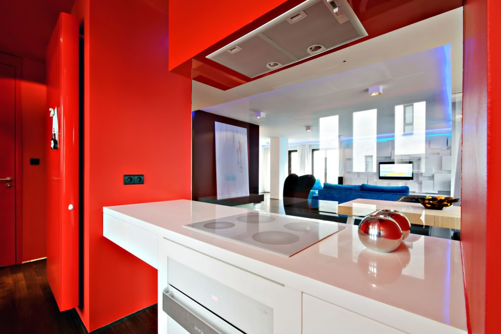 Created as a bold expression of modern avant-garde design, this extravagant luxury apartment in central Warsaw was remodeled with a combination of daring sharp colors counterbalanced with white accents and modern décor to create an atmosphere of distinctive contemporaneous style.