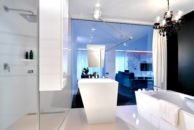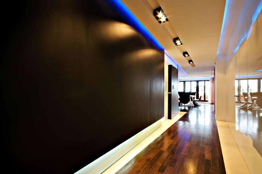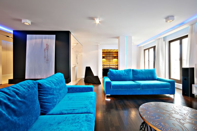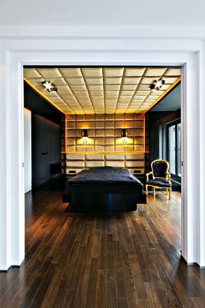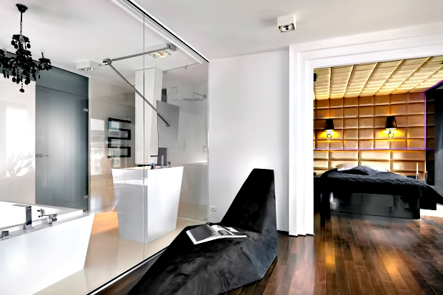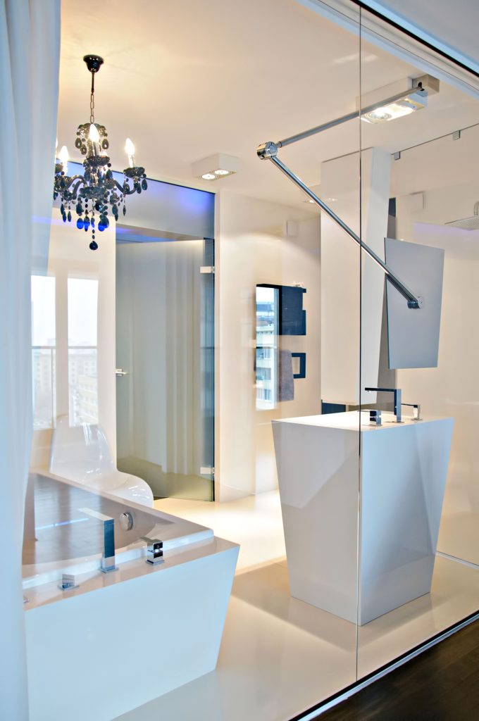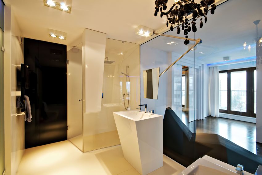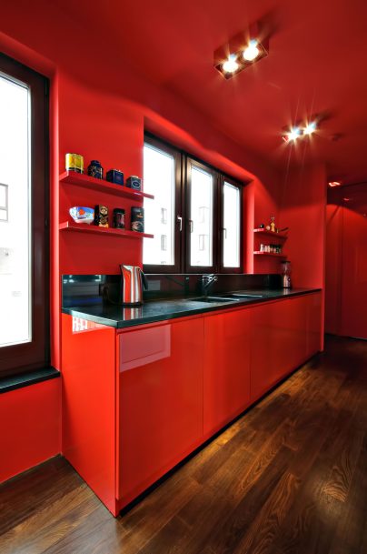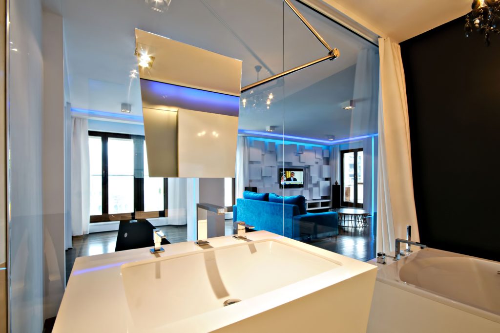 Created as a bold expression of modern avant-garde design, this extravagant luxury apartment in central Warsaw was remodeled with a combination of daring sharp colors counterbalanced with white accents and modern décor to create an atmosphere of distinctive contemporaneous style.