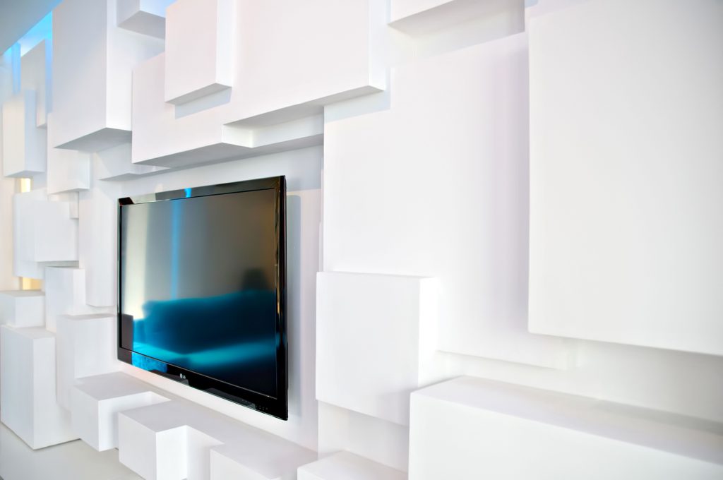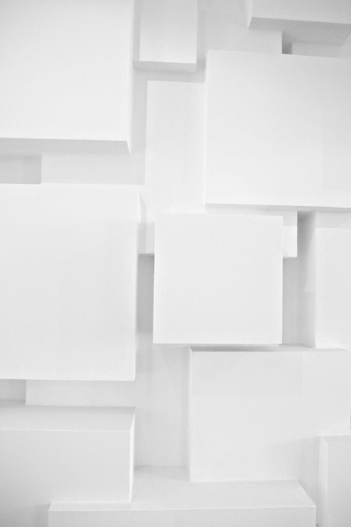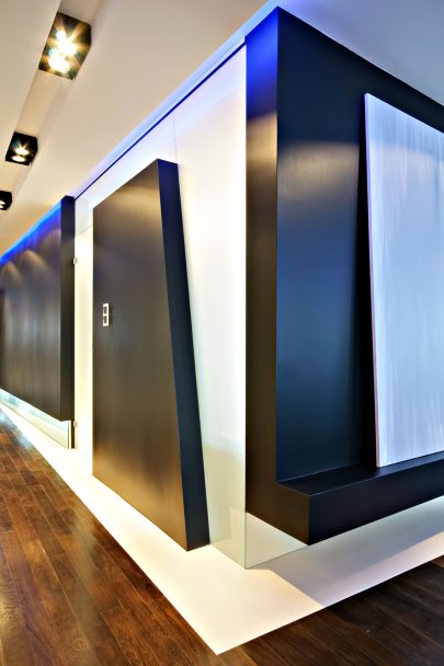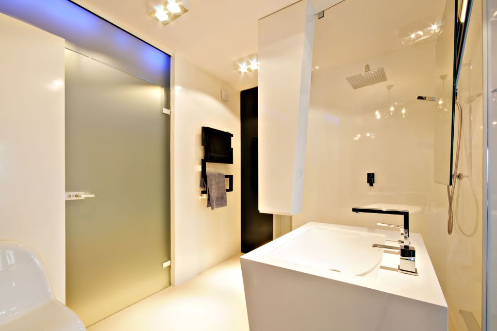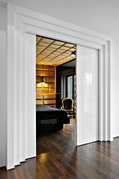 The futuristic apartments floor plan was designed to offer maximum open space with a clear separation of functional individual living zones such as the kitchen, living room with dining area, bathroom and bedroom. Sliding doors were inserted in the walls between zones so that they would “disappear” during the day. In addition, transparent materials and void areas visually unify the apartment space between the zones creating a cohesive yet separate living environment.