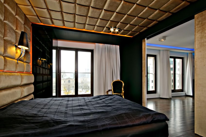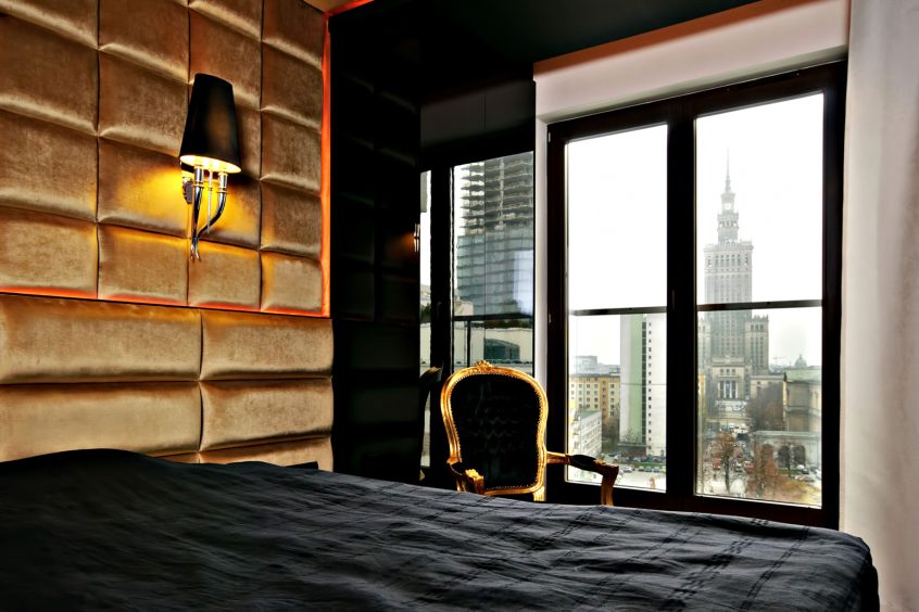 Located in the heart of Warsaw, the apartment enjoys a beautiful setting near the Palace of Culture, one of the most emblematic buildings in Poland. The large windows of the spacious residence offer spectacular panoramic views of the city skyline and Grzybowski Square.