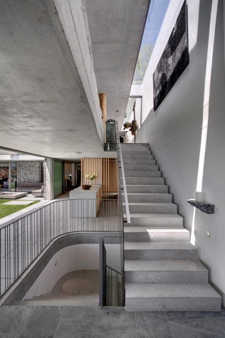 Situated on a relatively tight site, the design of the residence required innovative thinking to maximize the available space. The architects achieved this by incorporating dynamic variations in levels. Built across four floors, each area within the house possesses its own distinct identity while maintaining an open-plan layout. A striking redwood and grey-shale façade greets visitors as they enter a sculptural courtyard and make their way into the entrance gallery. From this initial taste of the home’s impact, one can expect to encounter elements such as sculpture, dramatic volume, far-reaching views, and raw textures like rock, timber, and concrete that contribute to the overall aesthetic.