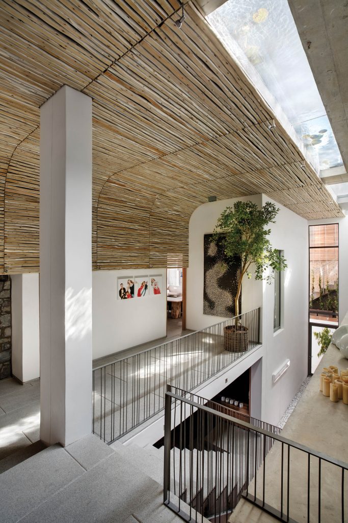 The interiors of the residence take occupants on an emotional and sensorial journey. Art plays a pivotal role, with carefully selected pieces creating an immediate impact upon entry. The couple’s dream of having a dedicated gallery is realized here, with plans to gradually fill the space with special pieces over time. This vision shaped the overall feel of the house, characterized by large expanses of wall, new spaces, and a minimalist approach to decoration. Furnishings are intentionally kept minimal, allowing the layers of finishes to take center stage. Stefan Antoni explains that each zone’s distinct mood was emphasized, resulting in a space that surprises and delights. The decor embraces a broad range of textures and finishes, evoking a natural and subtly organic ambiance that prioritizes comfort, tranquility, and serenity. Color is deliberately kept to a minimum, allowing the surrounding exterior views, the mountains, the ocean, and the sky, and the artwork to bring vibrant touches into the space.