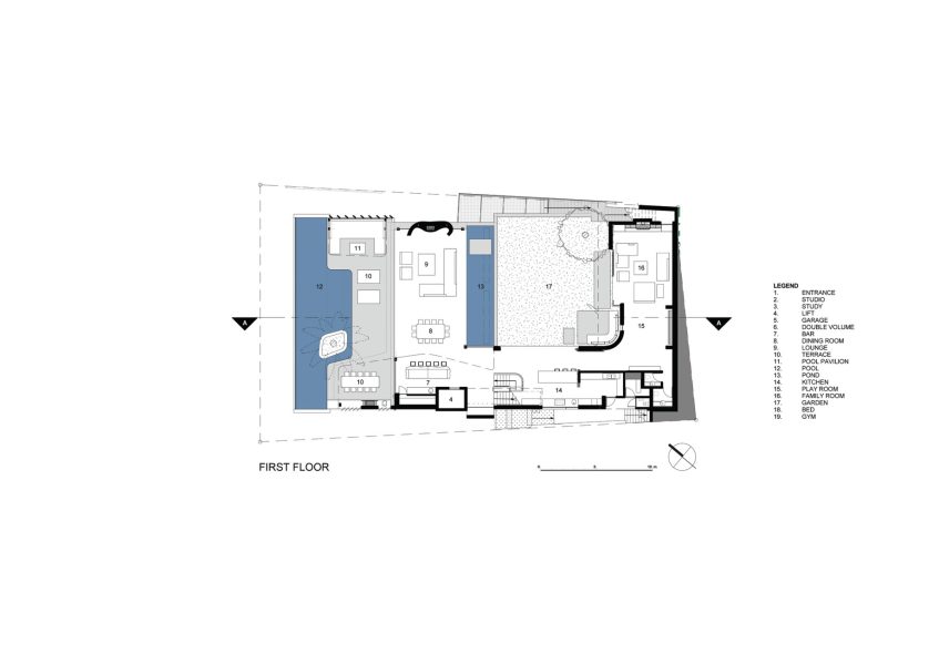 Although oriented toward the sea, with a pool terrace facing west, the residence also opens up to an east-facing courtyard garden. Sliding glass doors seamlessly connect these outdoor spaces to the interior, blurring the boundary between inside and outside. The living level’s configuration ensures that children remain visible at all times, whether they are playing outside, watching TV, or swimming in the pool. This combination of challenging architecture and family practicality showcases a brilliant balance. The bedrooms were also designed with children in mind, featuring sliding doors that lead to matching window seats framing picturesque sea views. The pool terrace offers two pavilions—an area for lounging at one end and a braai-and-dining area at the other.