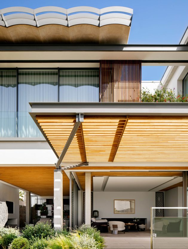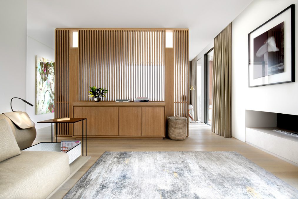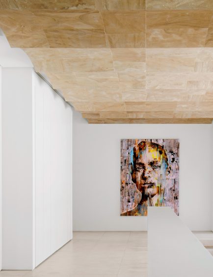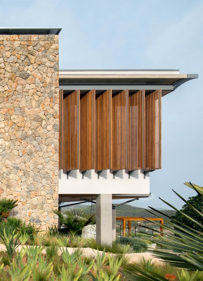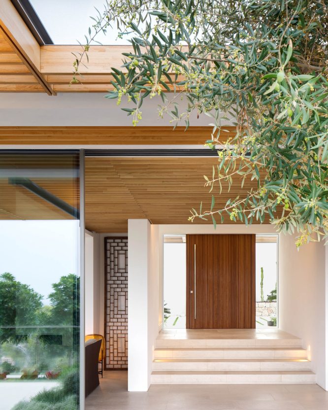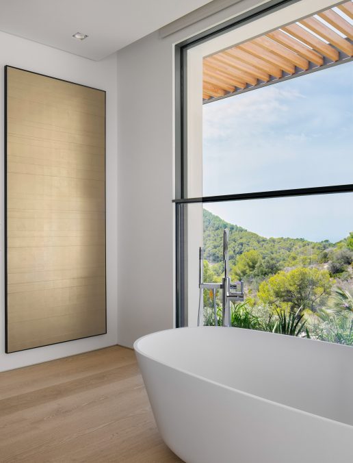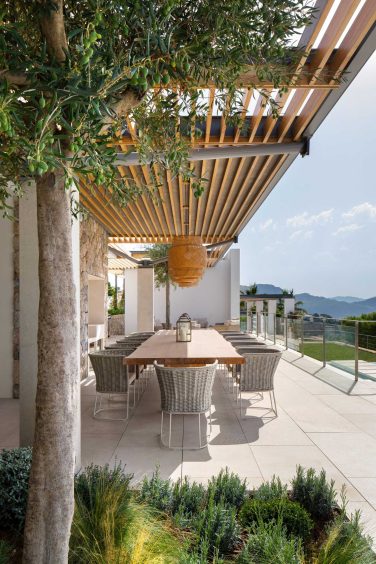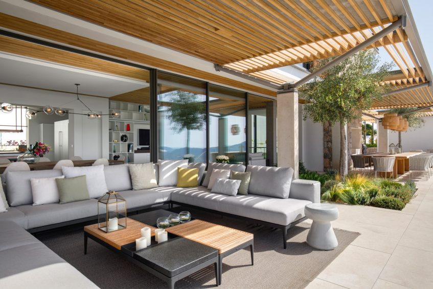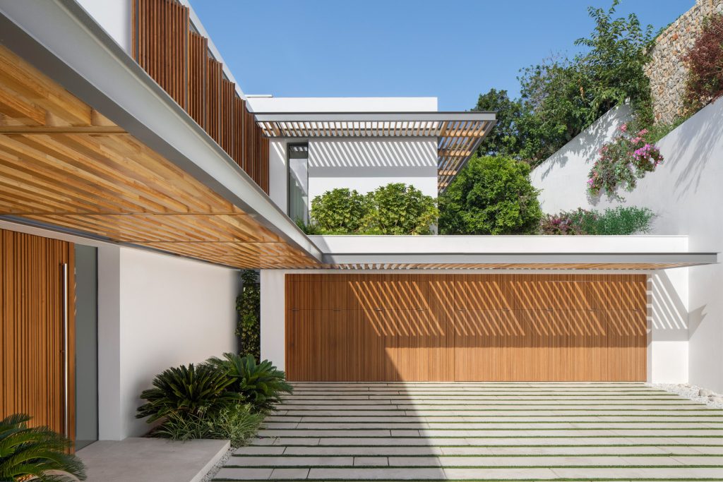 The building embraces a passive design approach, featuring deep overhangs, sliding shutters, screens, and recessed doors and windows, allowing natural light and ventilation to fill the interior spaces. The interiors, curated by ARRCC and Revuelta y Stahn Architects, embody a neutral and understated elegance, complemented by textured and handcrafted pieces. Furnished with renowned brands such as Minotti, Giorgetti, Poliform, and Molteni & Co., the spaces strike a balance between comfort and elegance. The dining room showcases a custom Pierre Cronje French Oak dining table accompanied by Paola Lenti dining chairs, while the artwork is sourced from the client’s private collection.