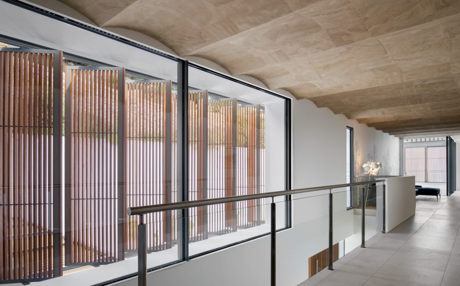 The sloping site posed challenges, but careful placement of the building allowed for comfortable pedestrian and vehicular access. The linear terraced building takes advantage of the site’s length, ensuring uninterrupted views from every important room on both the terrace and bedroom levels, with a strong emphasis on outdoor living. Green pause spaces punctuate the linear arrangement, while stone walls act as anchors at the building’s ends. The fusion of contemporary design with regional influences is evident in the exterior’s upper eaves and internal gallery, which reinterpret traditional curved tiled roofs as stone vaults.