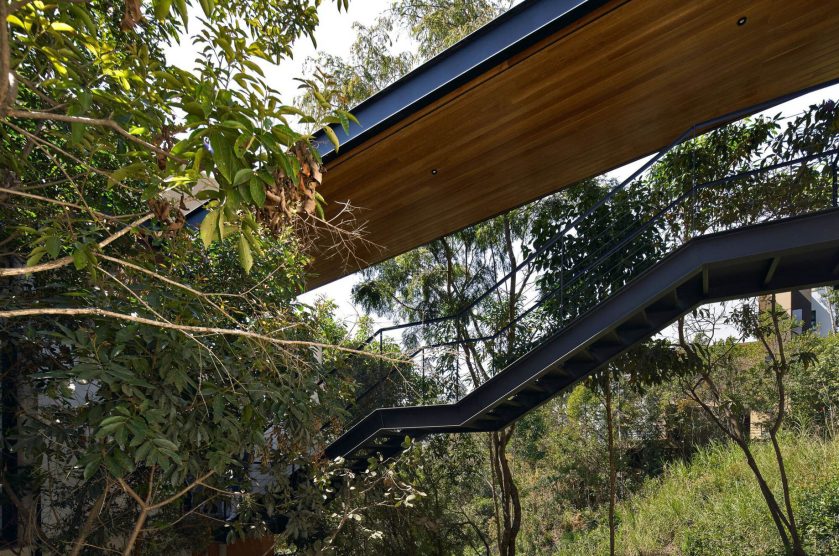 Intertwined with nature, the Bosque House is nestled within the lush embrace of a rainforest in Nova Lima/MG in harmonious integration with its surroundings. This architectural marvel ingeniously adapts to the site’s steep incline, with distinct levels artfully designed to complement the undulating terrain. Majestic trees, thoughtfully positioned within the heart of the dwelling, play a dual role: not only do they imbue the interiors with an ever-changing interplay of light and shadow, but they also sculpt a unique “light promenade,” as aptly described by its resident.