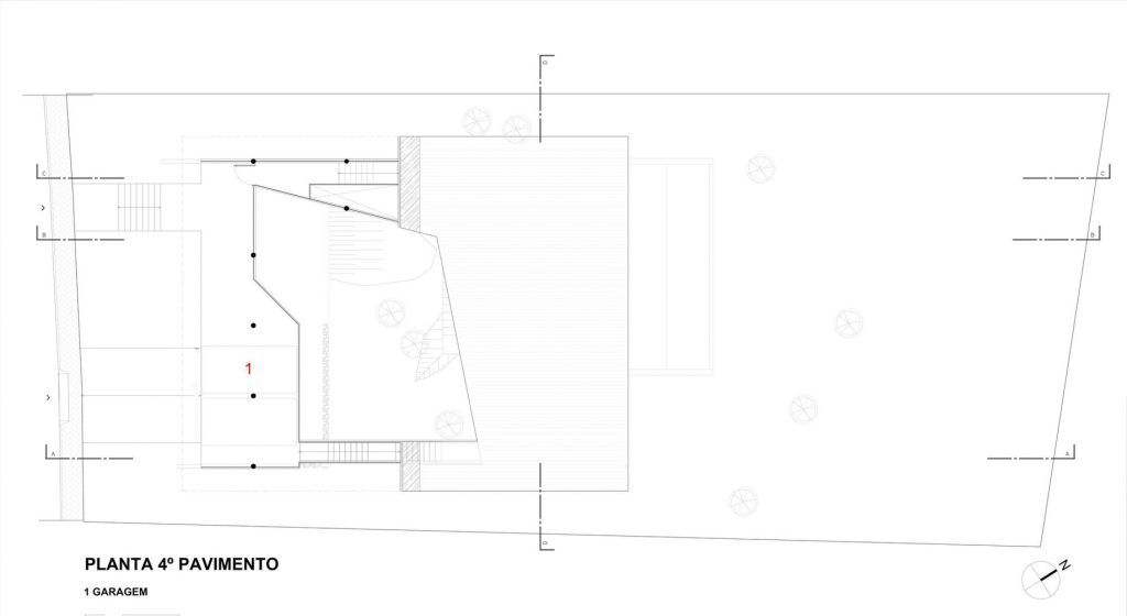 At street level, the Bosque House unveils its upper facade, revealing the garage and dual access points leading down to the lower floors. Here, a striking metallic staircase on the right side offers a lofty traverse above the verdant canopy, providing a captivating passage through the treetops. The lower floor, crowned by a dynamically pitched roof, opens to a spacious living and kitchen area, where panoramic views of the mountains and the surrounding Atlantic Forest are seamlessly woven into the living experience. This roof, characterized by an angular incision, cradles a central void, preserving the verdure at the heart of the site, ensuring a symbiotic coexistence between architecture and nature.