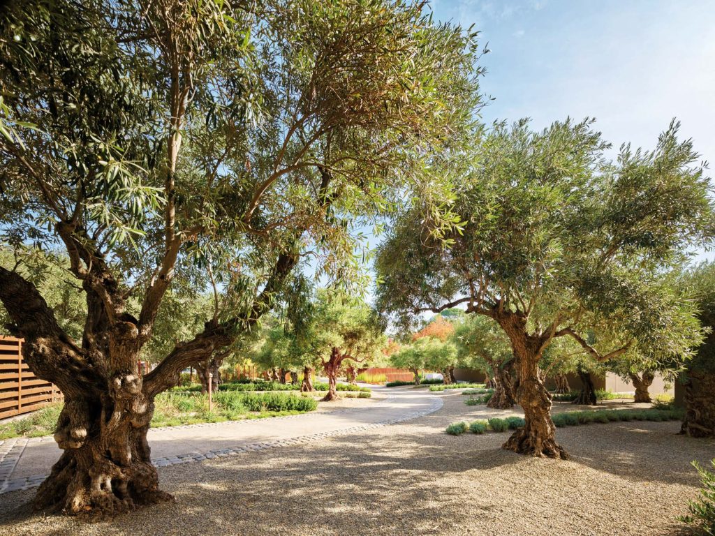The Woodside Residence was named Uliveto, which means “olive orchard” in Italian, for the trees that Surface Design planted to create the welcoming entry experience from the street. The driveway winds through a grove of ancient olive trees, which is lined by hedges of dwarf olives and rows of lavender, leading to a court of sculptural succulents that frames the house’s main entry. The meandering paths in the perennial meadow offer a unique and varied seasonal experience, while a belt of native perennials and evergreen shrubs create a buffer around the site, stitching into the surrounding rural landscape. The Woodside Residence is a testament to harmonious integration with the natural landscape, from its thoughtful design to the carefully curated planting schemes.