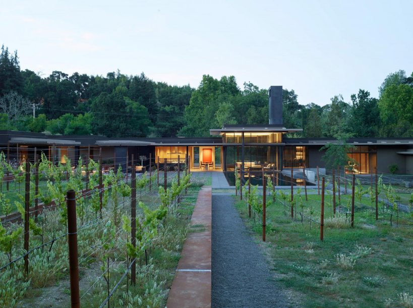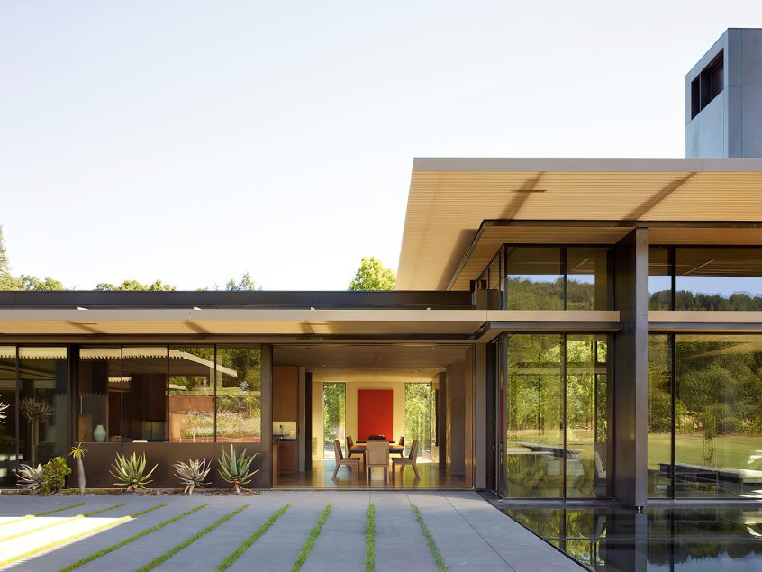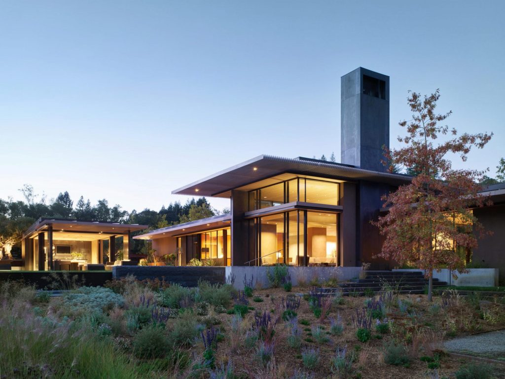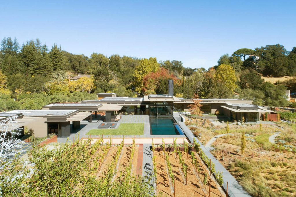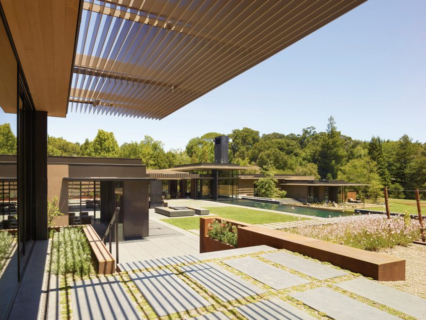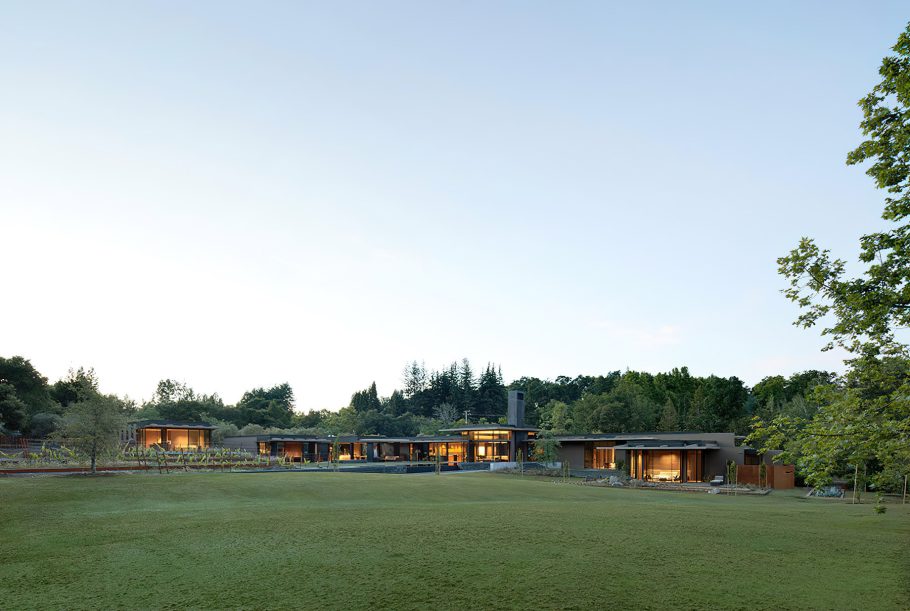 The California Meadow House, located in the Santa Cruz Mountains of California, seamlessly blends into its three-acre site in Woodside. Designed to blur the line between the home and its surroundings, the architecture unfolds as a series of low volumes extending towards the distant summits. The property is screened from the adjacent streets and bridle trails by a California native palette of woodland trees and shrubs that transition at the main gate to a contemporary Mediterranean planting palette, luring the residents and visitors into the front yard. The entry experience is a winding journey through an orchard of ancient olive trees that are lined by hedges of dwarf olives and rows of lavender.