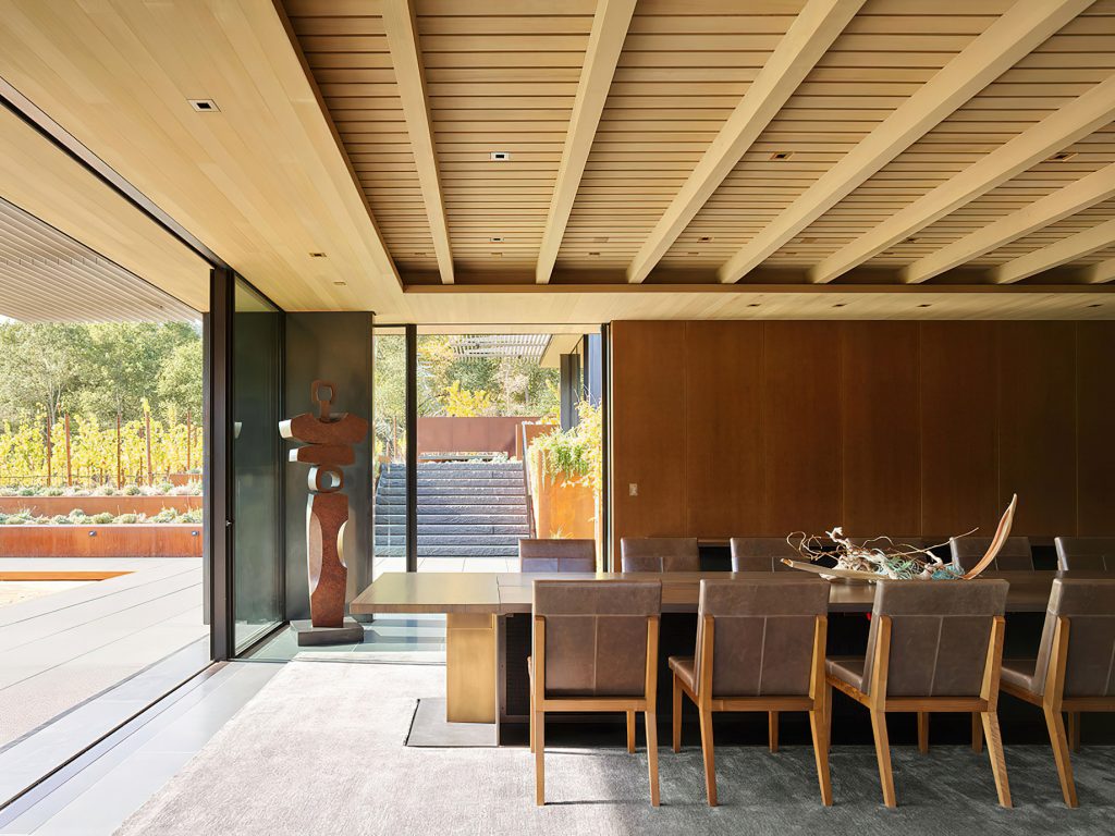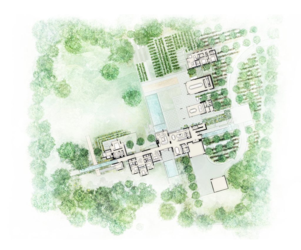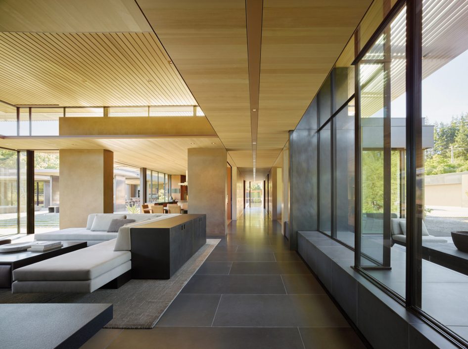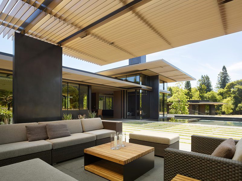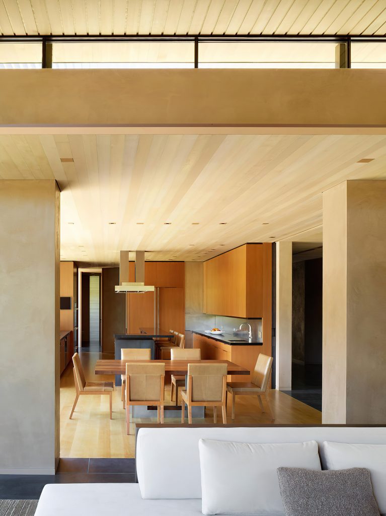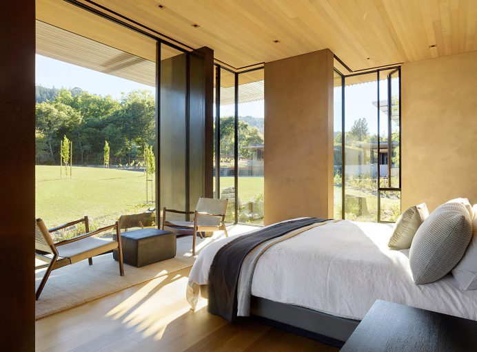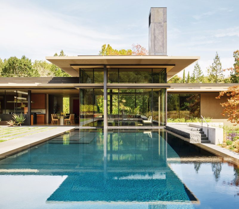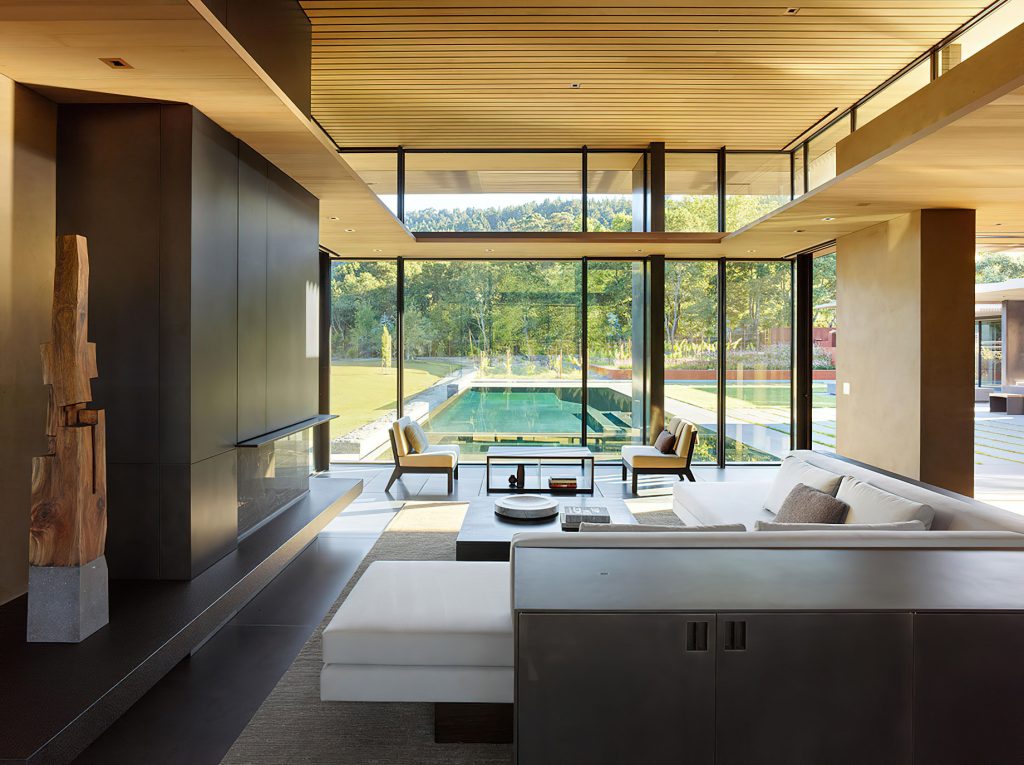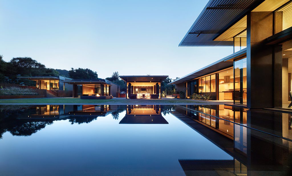 Designed by Jim Olson of Olson Kundig Architects, this family estate is a seamless, flowing expression that unites architecture, interior design, art, and landscape into a cohesive whole. The central “home base” living area serves as the nucleus, with views extending in four directions across multiple reflecting pools and into gardens and the Santa Cruz Mountains beyond. While the estate includes three auxiliary buildings and expansive outdoor living areas, the design’s understated sophistication blends the home into its lush surroundings. By creating interstitial spaces between the various structures, the landscape becomes an integral part of the design, resulting in a quietly elegant family retreat that embraces the mild climate of California’s Bay Area.