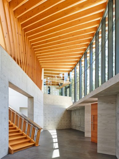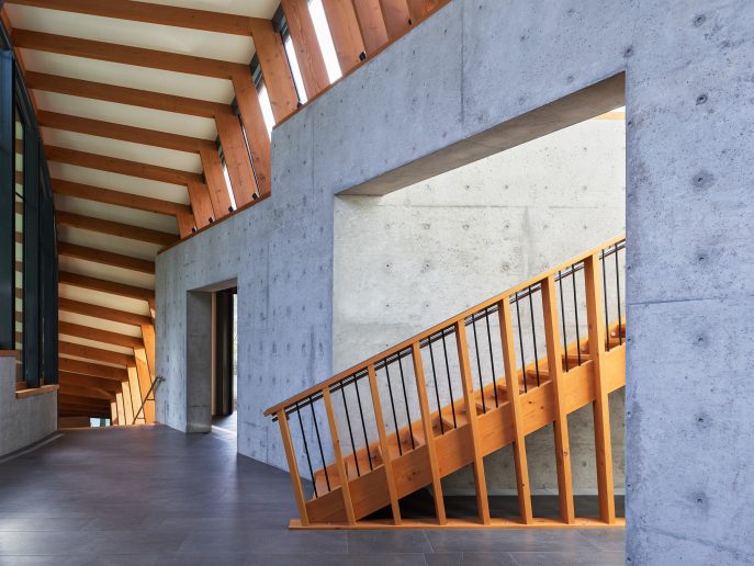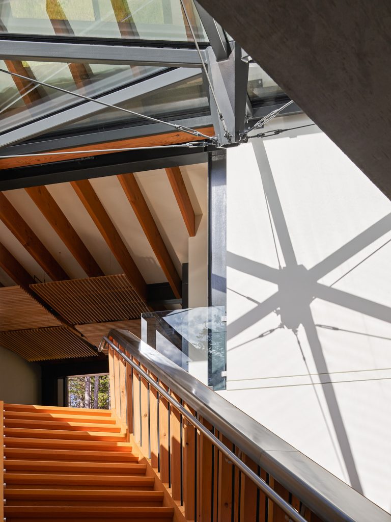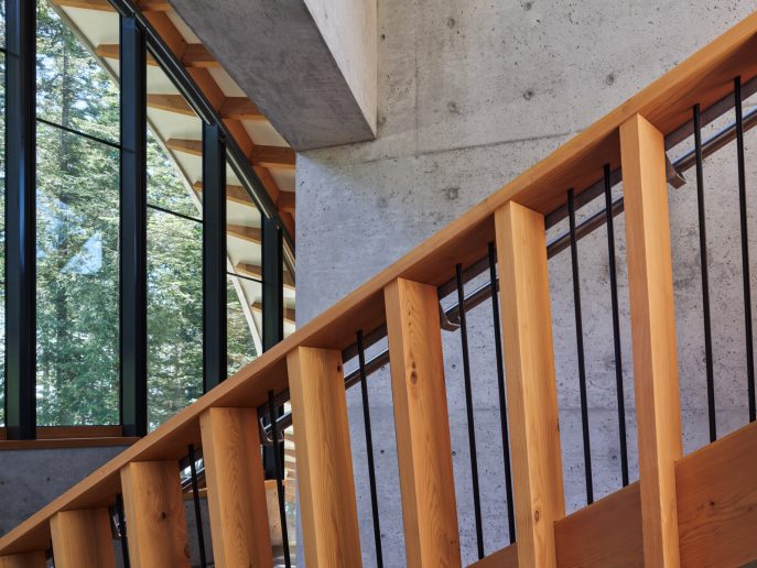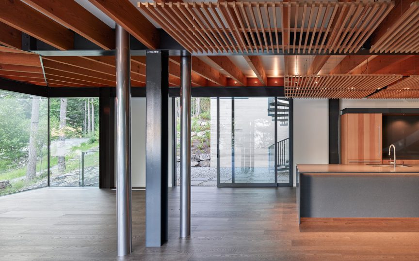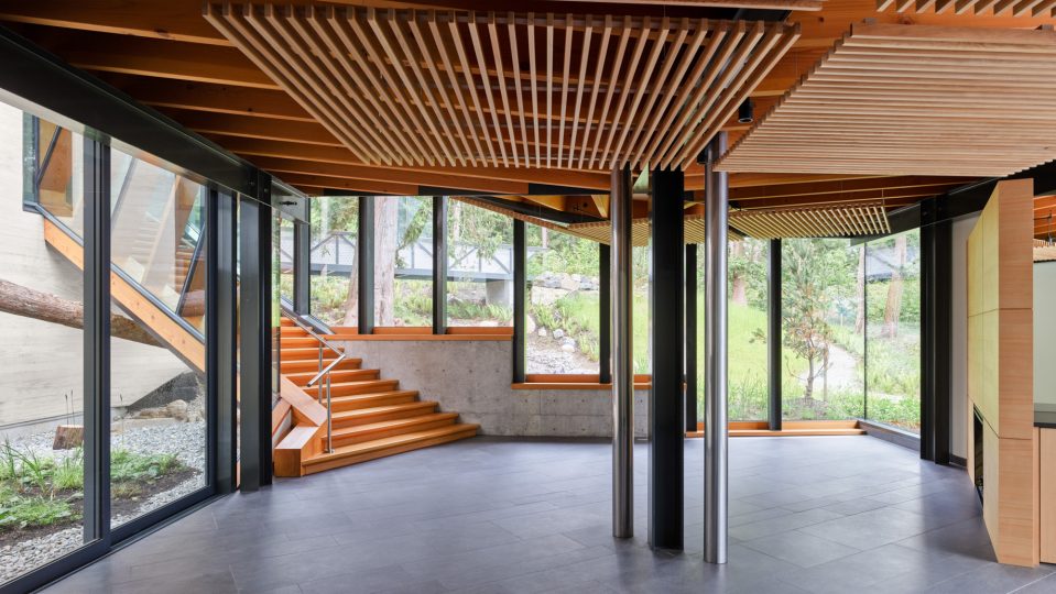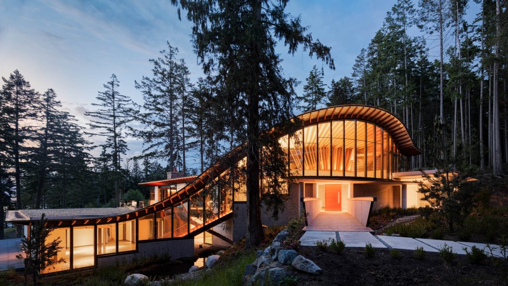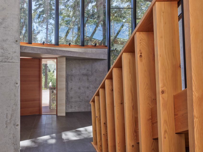 Cape House, designed by Grant Architecture Studio, is located on the pristine shores of Cape Roger Curtis Lighthouse on Bowen Island in British Columbia. The residence was designed with an iconic blend of concrete, wood, and glass, strategically placed to immerse its inhabitants in the island’s natural beauty. The home’s artful juxtaposition of concrete and wood, improbable forms, and expansive glazing creates a dynamic interplay between indoor and outdoor environments, perfectly complementing the dense foliage and dramatic scenery of its surroundings.