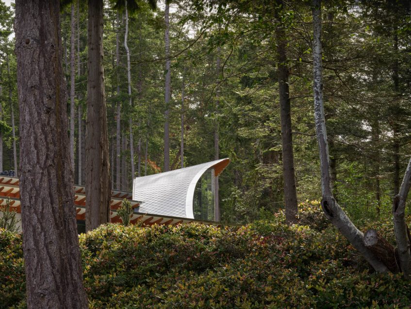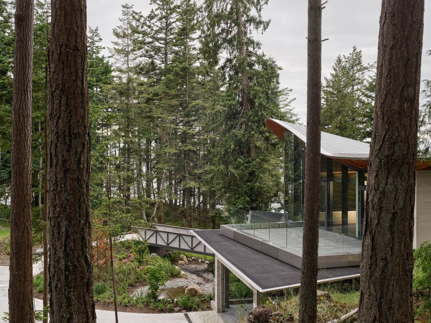 Set on the rugged Cape Roger Curtis Lighthouse point, this sculptural masterpiece designed by Vancouver based Grant Architecture Studio redefines coastal luxury, blending modern form with the raw beauty of Bowen Island. Distinguished by its unique wave-shaped roof connecting three cascading pavilions, this artistic residence offers a visually stunning interplay of concrete and wood that harmonizes with the dense, vibrant forest backdrop. Generous glazing and meticulous landscaping, featuring native species and water features, bring the Pacific Ocean and the lush West Coast rainforest seamlessly indoors, ensuring a tranquil, nature-infused living experience that celebrates breathtaking sunsets, marine wildlife sightings, and the invigorating beauty of Howe Sound.