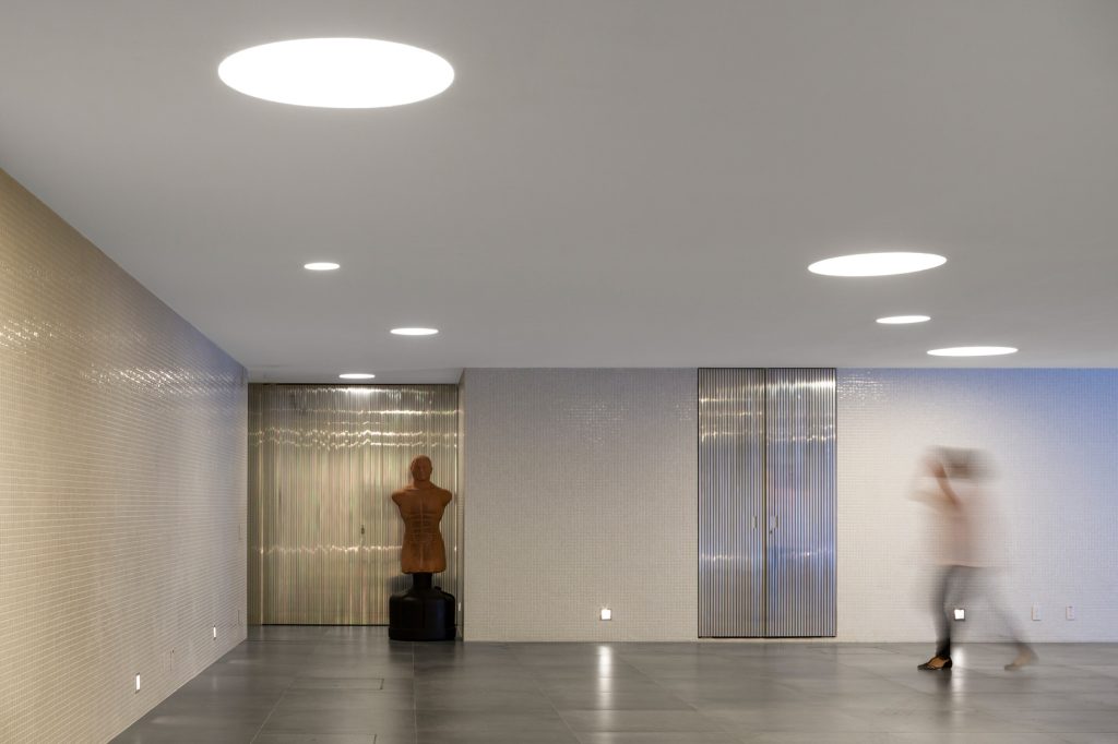 The home’s structural integrity is achieved through a combination of steel and concrete, with some elements concealed by the wooden box that defines the upper floor. This design choice provides a sense of lightness, contrasting the robust materials used elsewhere in the house. The lower level of 3V House includes a garage, service areas, a wine cellar, a workshop, and a gym with windows that overlook the pool area. This layout creates a dynamic relationship between the active and leisure spaces within the home, enhancing the overall living experience.