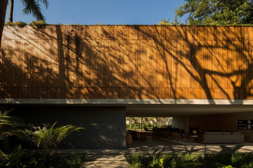 On the first floor, the bedrooms, offices, bathrooms, and closets are uniformly protected by wooden panels that cover all faรงades, ensuring privacy and a unified aesthetic. The vertical wooden strips offer a striking contrast to the horizontal concrete elements, adding depth to the design. The second floor is a small, recessed volume that sits atop the terraced garden, offering panoramic views of the Pinheiros River floodplain. This uppermost point of the house is designed to provide a serene escape, blending the built environment with the natural beauty of Sรฃo Paulo’s landscape.