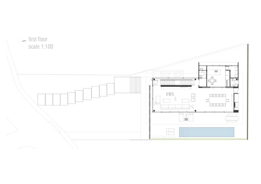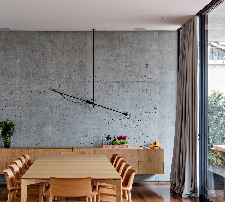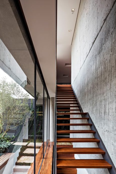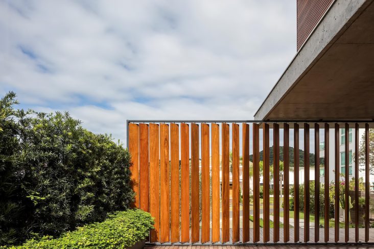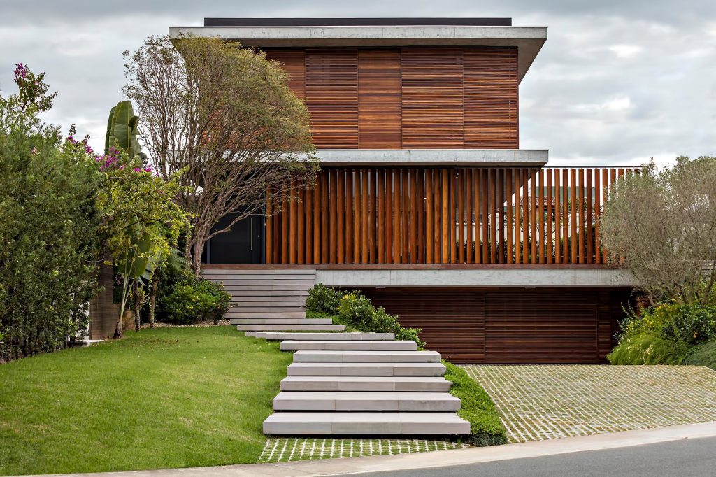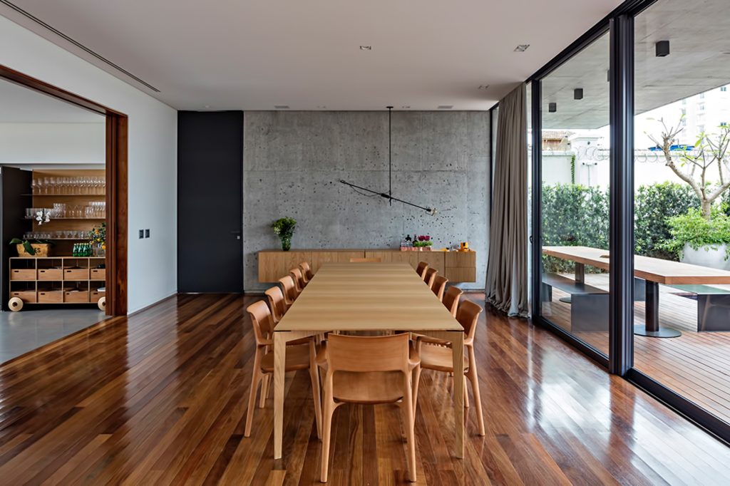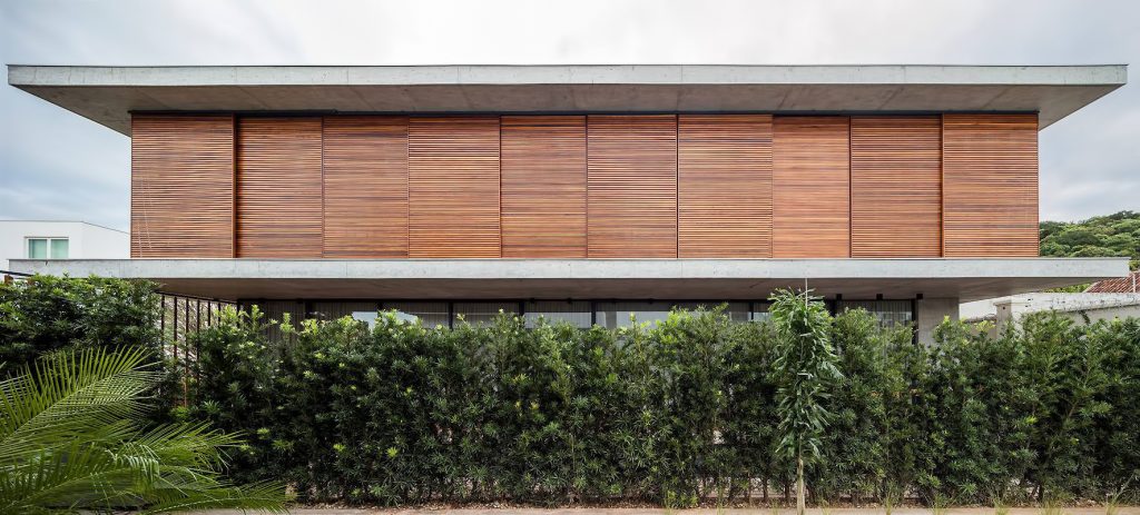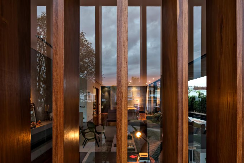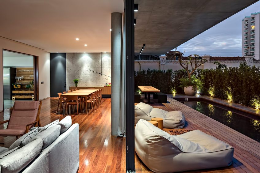 The garage is located on a lower level than the street. This way, the ground floor is on a higher position and allows the clear interpretation of the house’s program that displays a wooden vertical brise soleil, made of Cumaru, a Brazilian tree species. The same wood is repeated in the moving panels of the upper floor. The pool is located on the ground floor as an extension of the living and dining areas allowing for a vibrant indoor-outdoor living experience.
