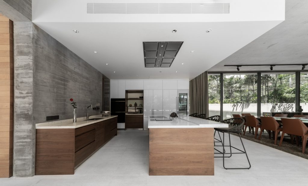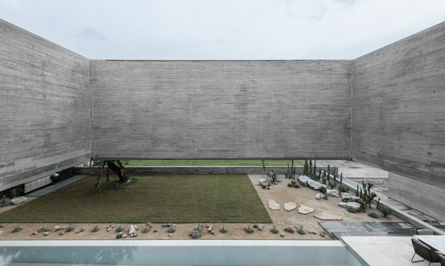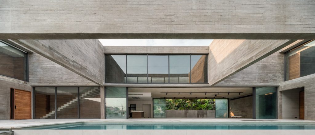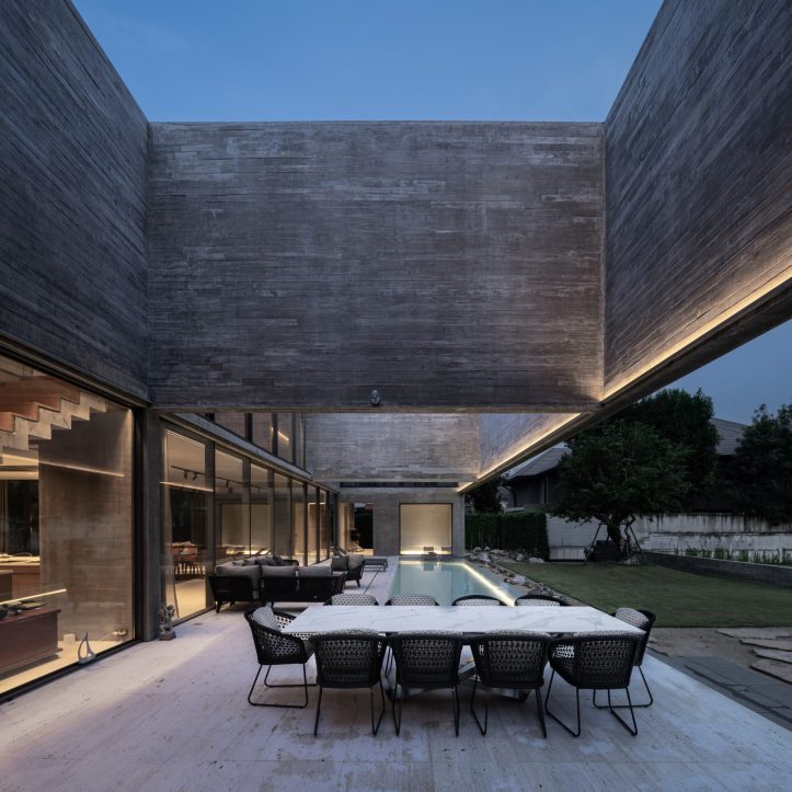 While providing visual barrier towards the surrounding neighborhood, the cast concrete planes also act as a buffer, providing sound barrier from the public road directly adjacent to the site. Divided into two levels, the semi-public living quarter on the ground compose of various thresholds that blur the lines between garden-pool-living and interior and exterior spaces, while the upper level consists of private quarters for its residents. Expressing the internal program and function, the planes divide each living quarter to maintain privacy and give distinction to each bounded space. Contrarily, the 37 m. long-span cantilevered plane on the second-floor act not only as the main façade of the residence, but a consistent ‘backdrop’ that tie each of the quarters together.