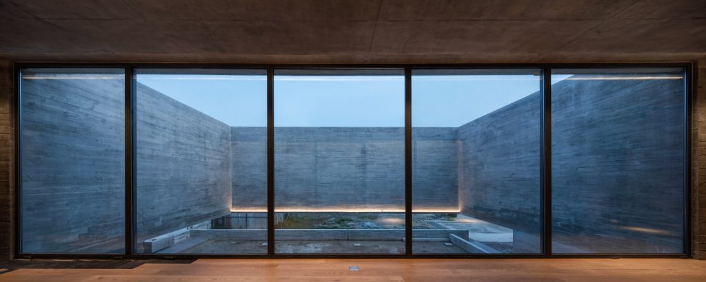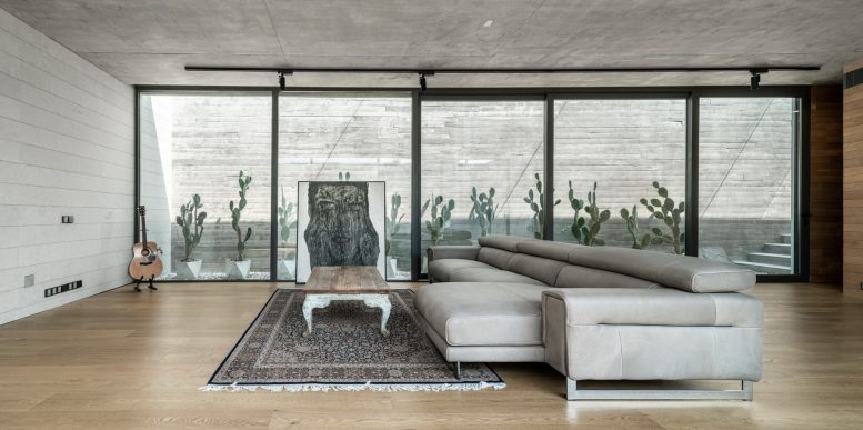 The materiality of exposed concrete is utilized in all its aspects; the wood framework leaves an imprint of their grain on the concrete as a permanent reminder of the construction process, while its texture is enhanced with lightwells and skylights. Casted on site, various experiments on formwork and texture were carried out to establish the fundamental material and character of the residence. The concrete planes on the ground level sit perpendicular to the site, while the walls on the second floor intersect at the opposite axis. The point of intersection between these two opposite planes provide the main structural system throughout the project. This pure structural composition allows for the architecture to be reduced to its absolute minimum, while also allowing for efficient construction and assembly time. The result is an architecture that is somewhat monolithic in its exterior, as its concrete slabs appear to be levitating from the ground, while containing a sense of place and home within its interiority.