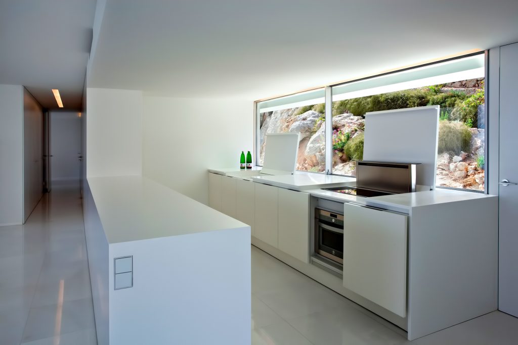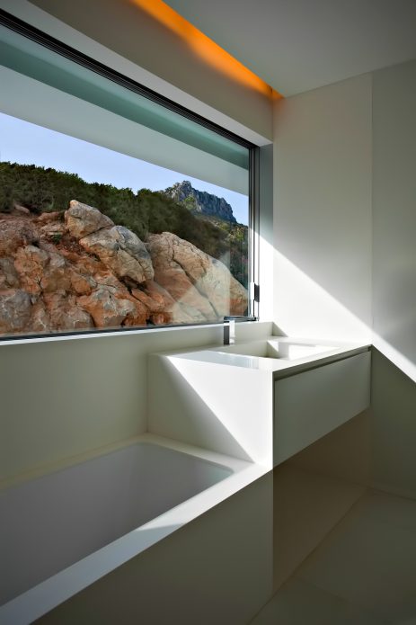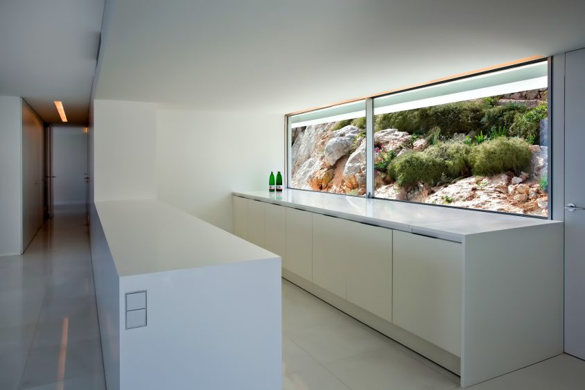 Straight lines and stark white faces reveal the modernity with which it was conceived on an abrupt plot of land overlooking the sea below. The monolithic, stone-anchored structure generates a horizontal platform from the accessing level where the house itself is located on the rugged landscape. The materials, walls, pavements, and the gravel on the roof, all maintain the same colour, respecting the traditional architecture of the area, emphasizing it and simultaneously underlining the unity of the house.