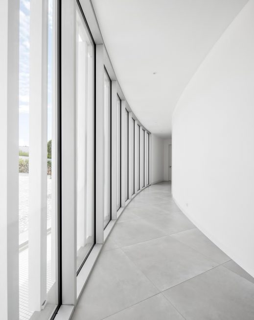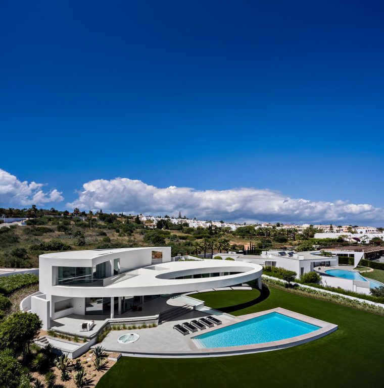 With its elliptical base, the house is deliberately sculptural and organic. It is shaped by the wind and the sea that wants to embrace the wide floating oval which subtly delimits the central patio of the house. With this, a contemporary, dynamic balance was reached, and the perfection of its fluid symmetry is revealed.