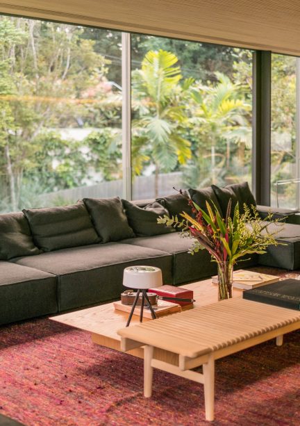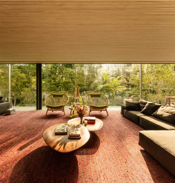 Fio House reimagines the conventional two-floor single-family home by reversing the typical layout. The architectural journey begins on the ground floor with a sculptural ramp that leads to a deck adorned with colorful armchairs and an outdoor fireplace, all set against the backdrop of a verdant garden. The house’s design emphasizes seamless transitions between indoor and outdoor spaces, achieved through extensive use of glass, particularly in the living room, which offers an unobstructed view of the treetops. The light wood ceiling inside mirrors the materiality of the facade, creating a cohesive visual connection between the interior and exterior.
