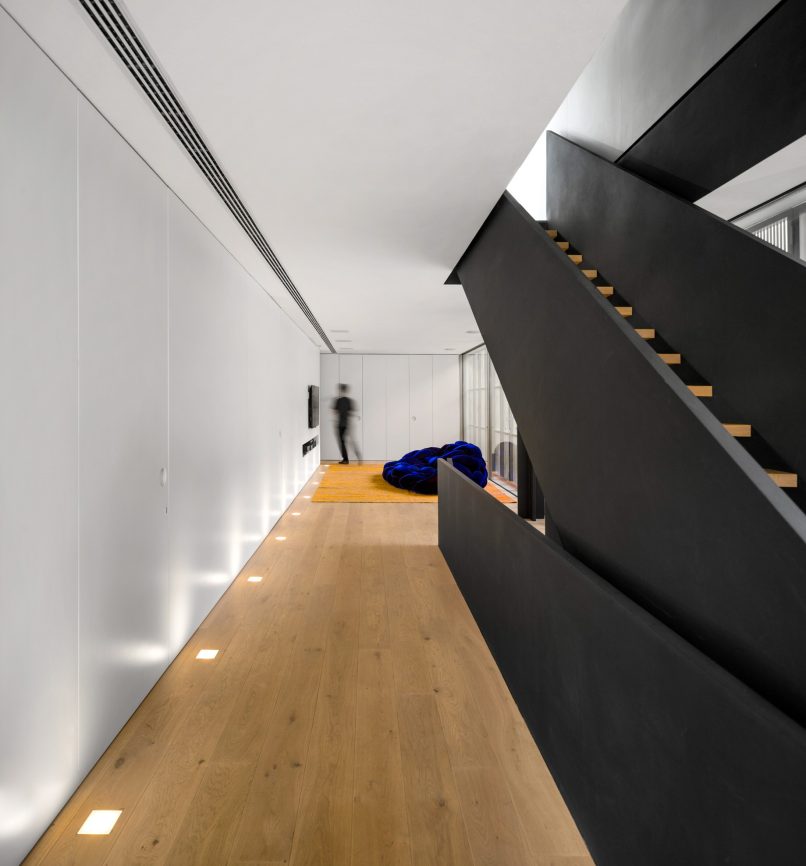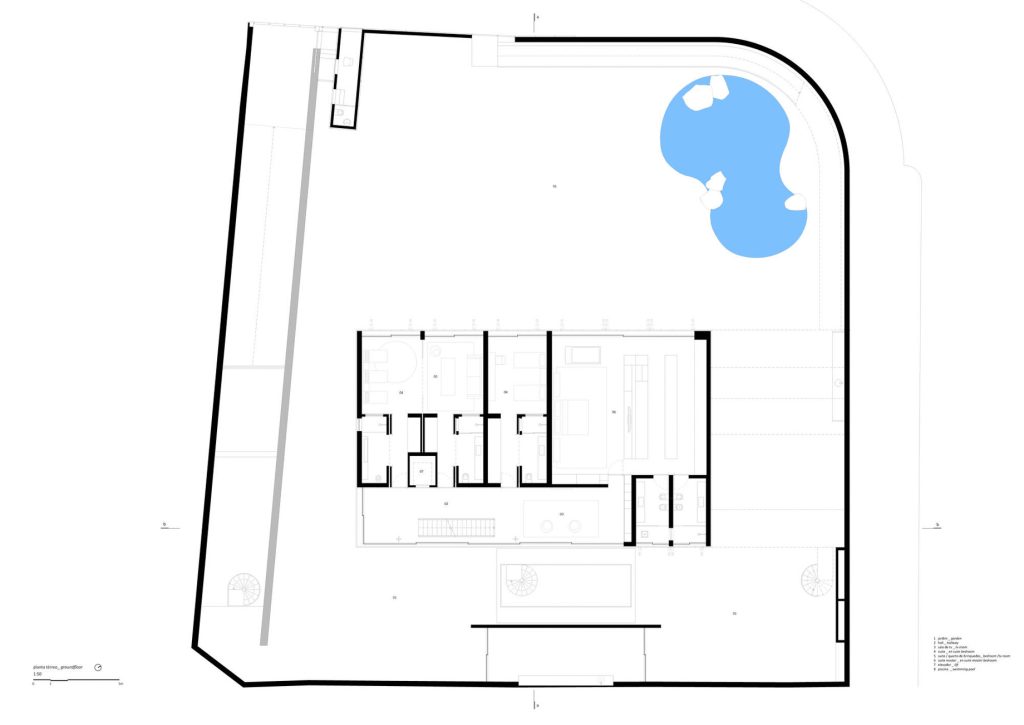 The ground floor bedrooms, in direct communication with the garden and its organically shaped swimming pool, reflect a different interpretation of visual permeability. Unlike the living room, which prioritizes visual transparency, the bedrooms offer a more tactile connection to the outdoors, with spatial continuity blurring the lines between the interior and the garden. Wooden brise-soleil provide shade and climatic comfort, enhancing the sense of tranquility within these private spaces. The design’s emphasis on creating a harmonious relationship between the built environment and nature is evident throughout the home.