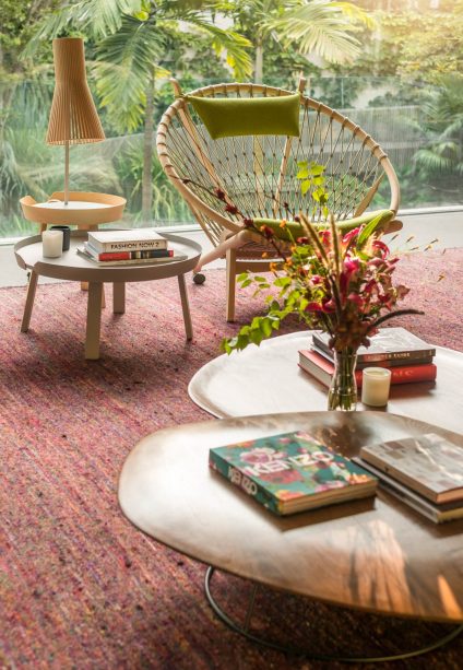 Fio House, by Studio MK27, redefines the traditional two-floor home layout by placing living spaces on the upper level and bedrooms on the ground floor. The architectural experience begins in the garden, with a sculptural ramp leading to a deck with colorful armchairs and an outdoor fireplace.