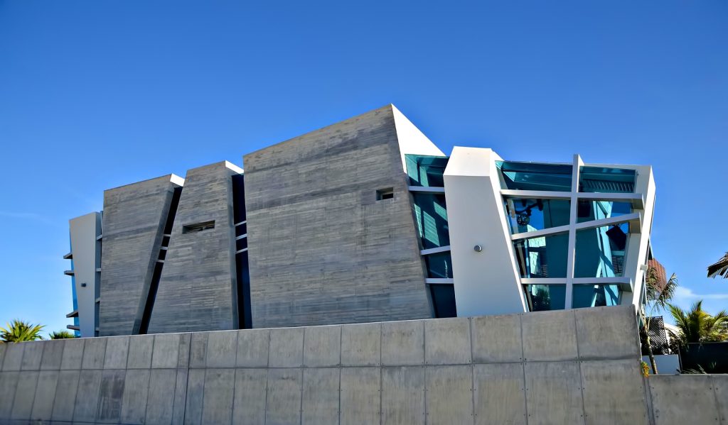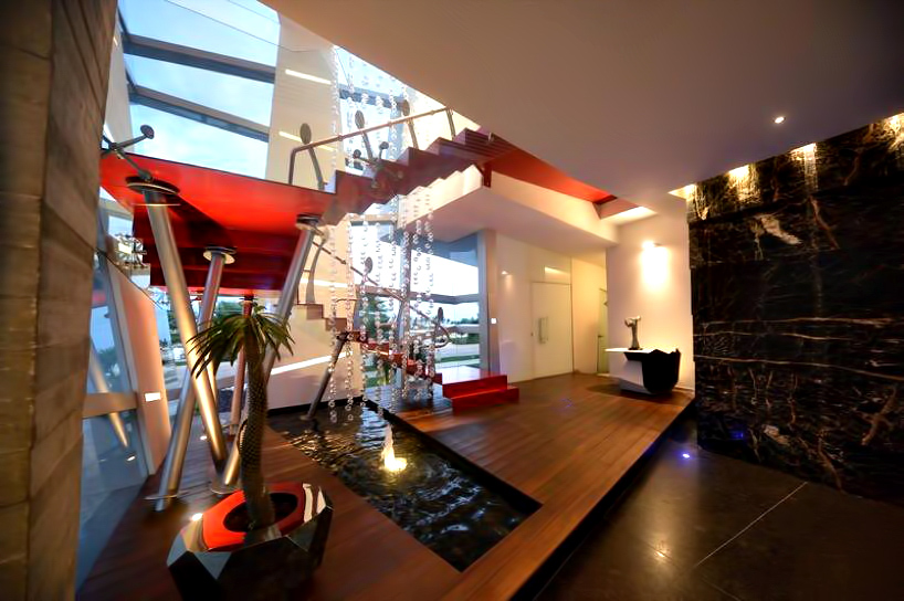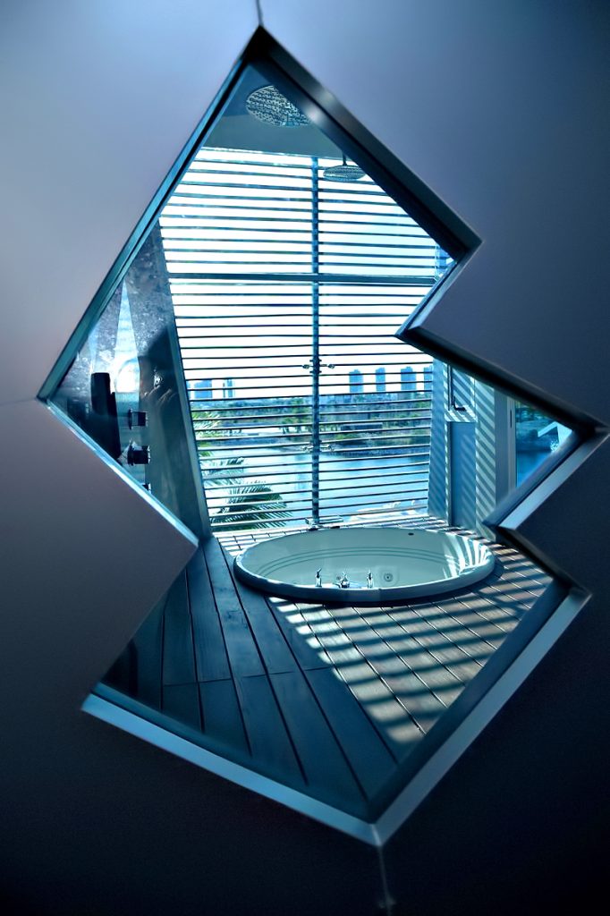 The selection of materials and textures was key to creating the unusual and edgy geometric environments. Secific Bisazza mosaic accents combined with granite and wood floors provide a balance between exposed concrete walls and glass windows. Avant-guard is an apt description of this alluring luxury residence that combines vivid architecture and vertiginous geometry.