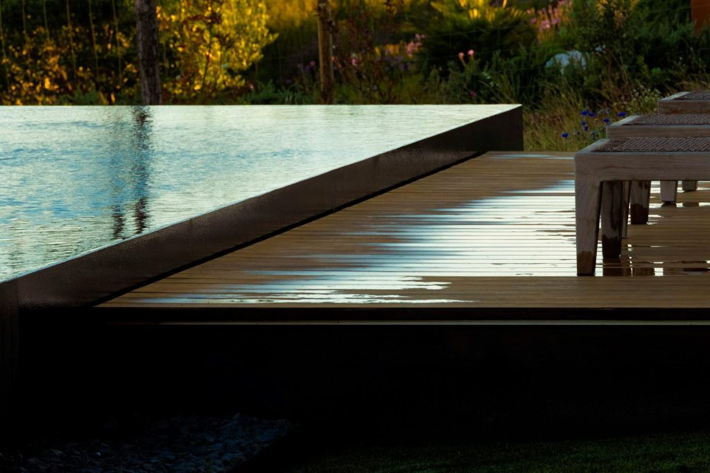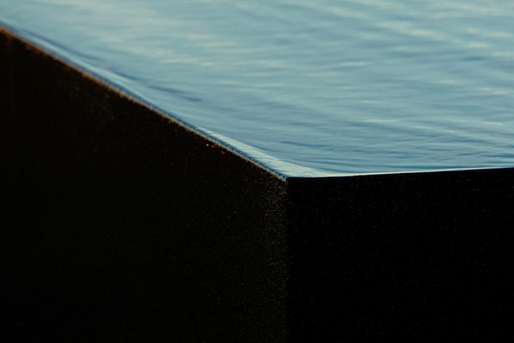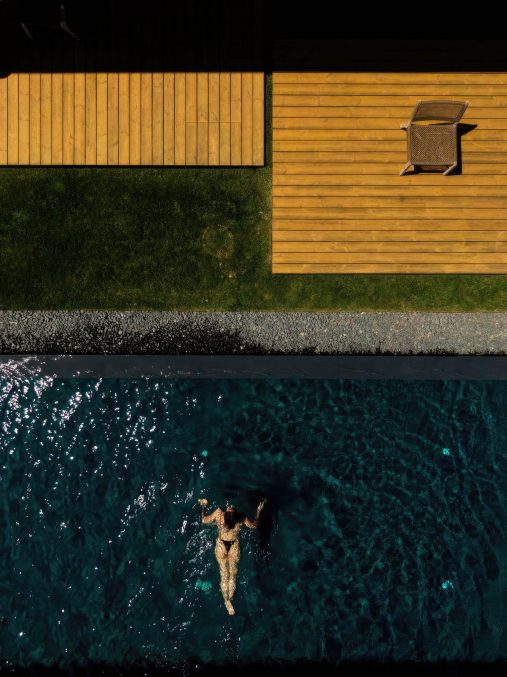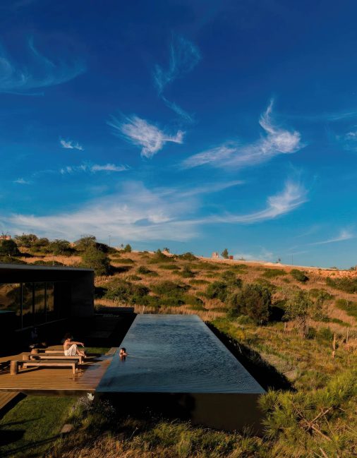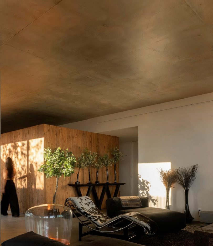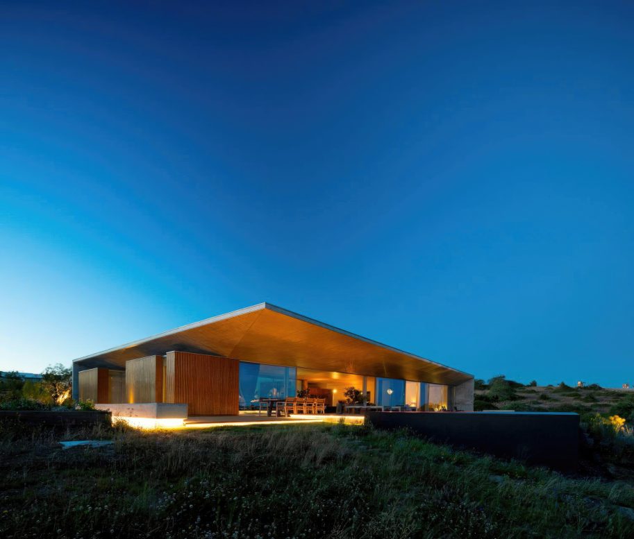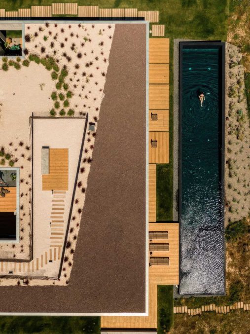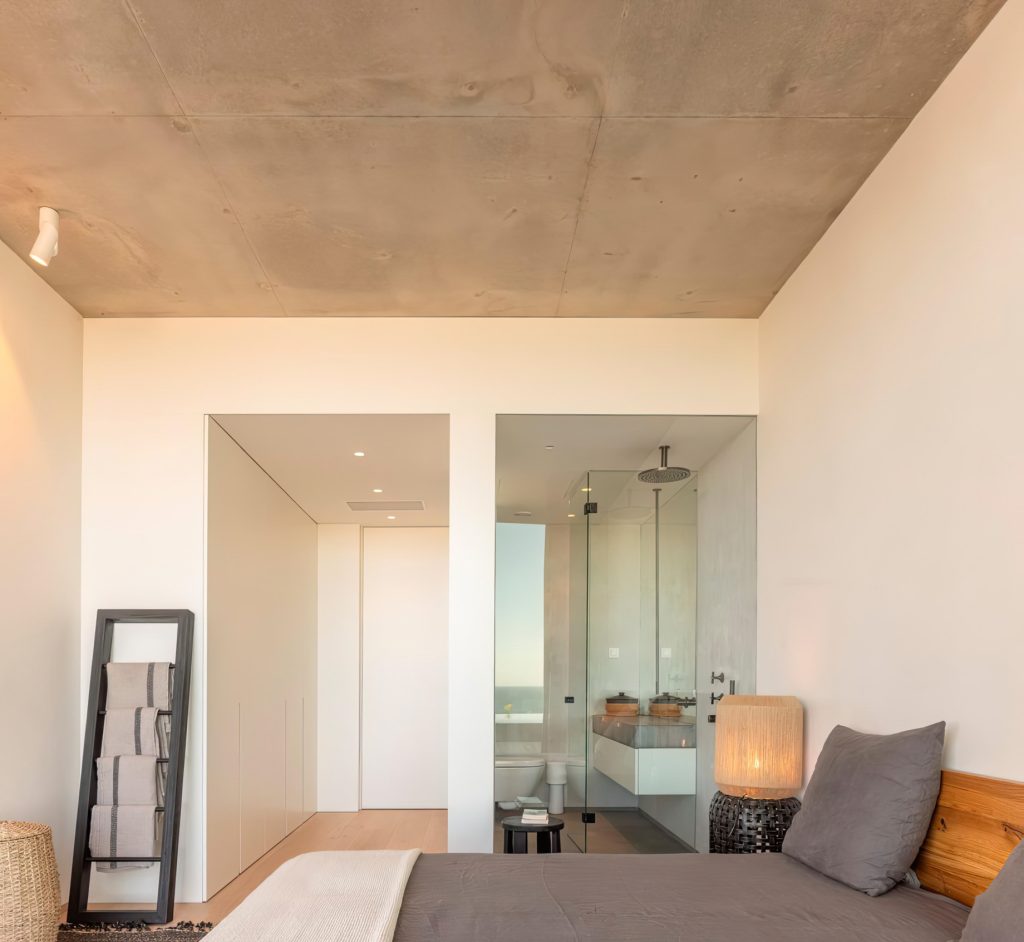 A defining feature of Casa Libre is its long, linear swimming pool, a monolithic black volume from which water appears to cascade on all sides, mirroring the surrounding sea. The roof, designed as a walkable green platform, extends the living space outdoors, connecting to a drought-resistant Mediterranean garden designed to evolve with the seasons. Inside, a solid wood entrance door leads to the patio, marked by a native carob tree, dividing the social areas to the south from four private bedrooms along the eastern wing. The architectural language merges modern minimalism with vernacular sensitivity, integrating the house into its landscape rather than imposing upon it.