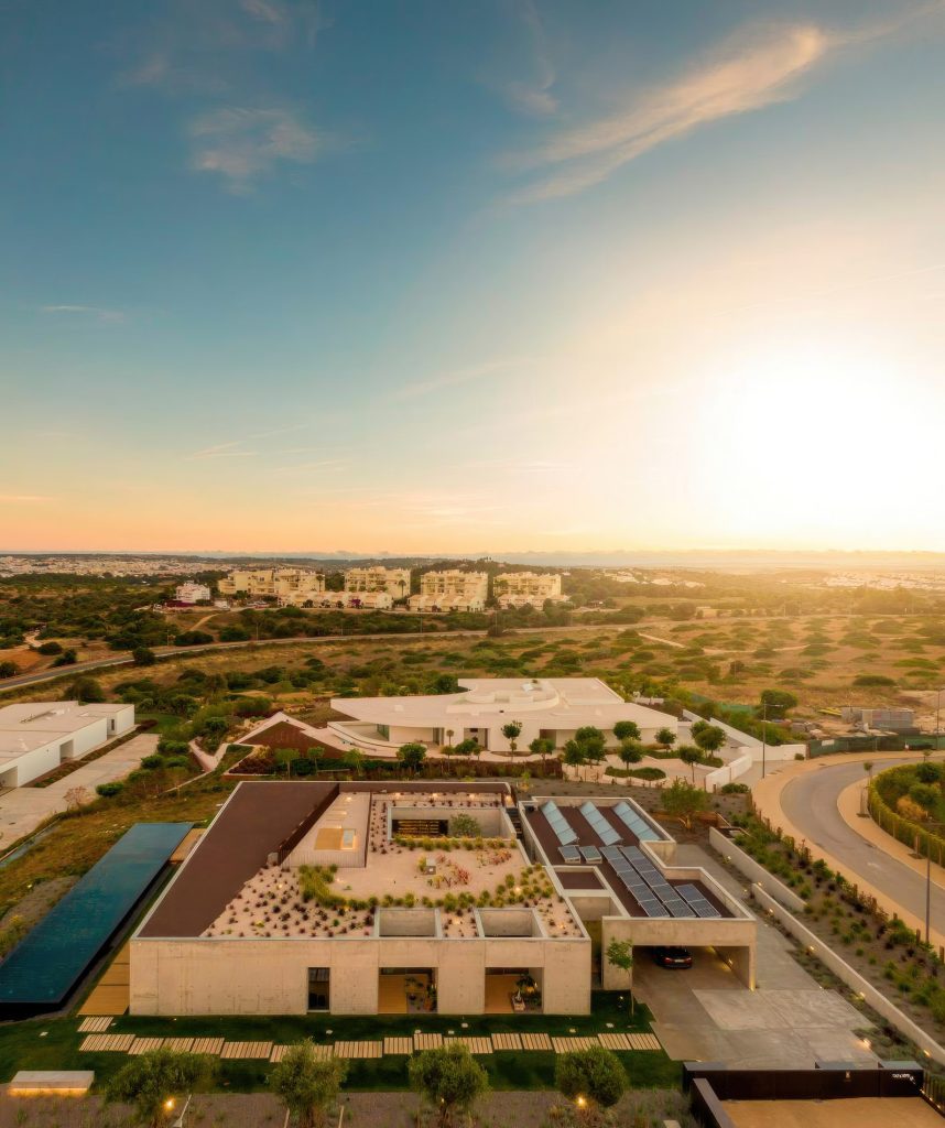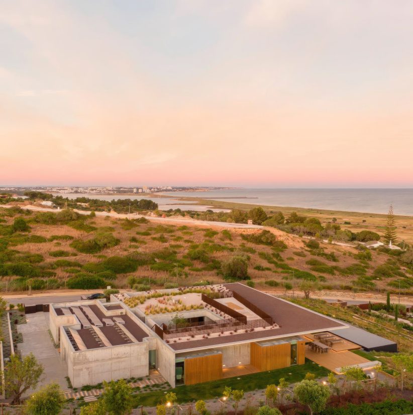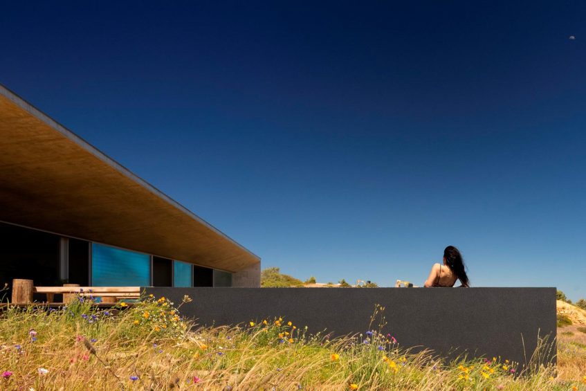 On a sun-drenched hillside overlooking the Bay of Lagos in southern Portugal, Casa Libre is a contemporary single-story residence by MΓ‘rio Martins Atelier that masterfully balances privacy and openness. Its orthogonal, clean-lined design in exposed concrete orients inward to a central patio, while expansive glazed openings face south, capturing panoramic ocean views. A slim, cantilevered canopy in matching concrete shades the terrace and garden, its minimal form lending lightness to the robust structure. The house is shaped by a duality of spaces, intimate corners for quiet reflection and wide, open areas for uninterrupted sightlines toward the Atlantic horizon.