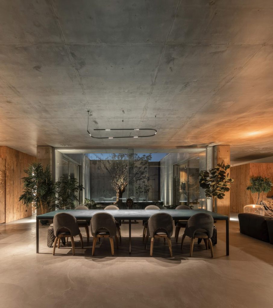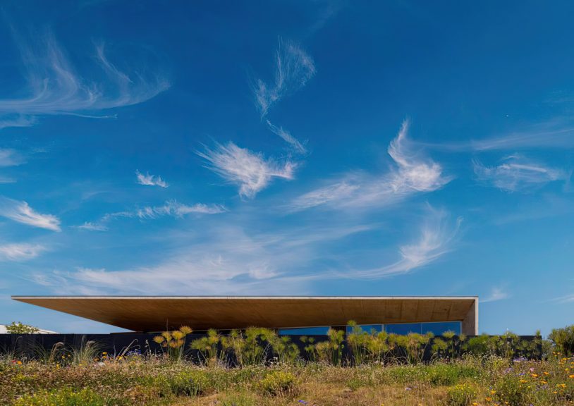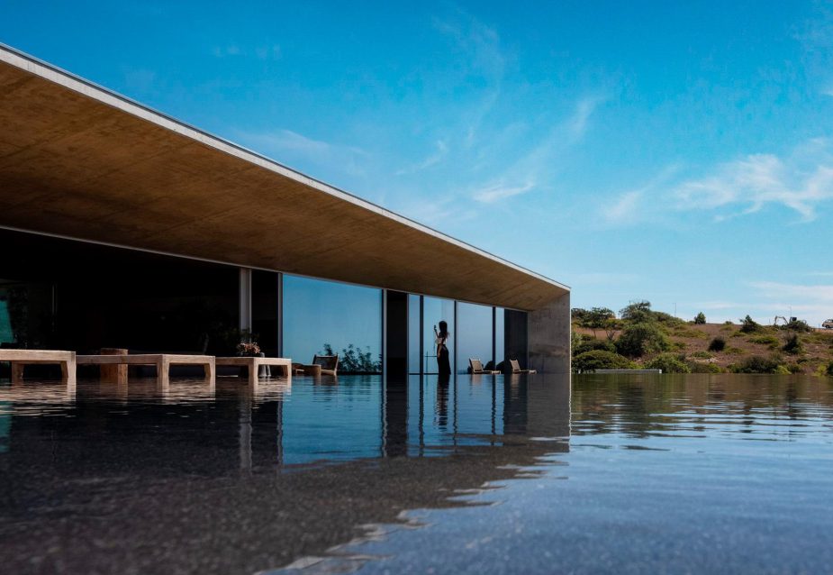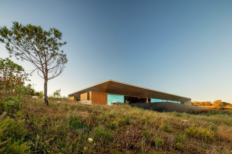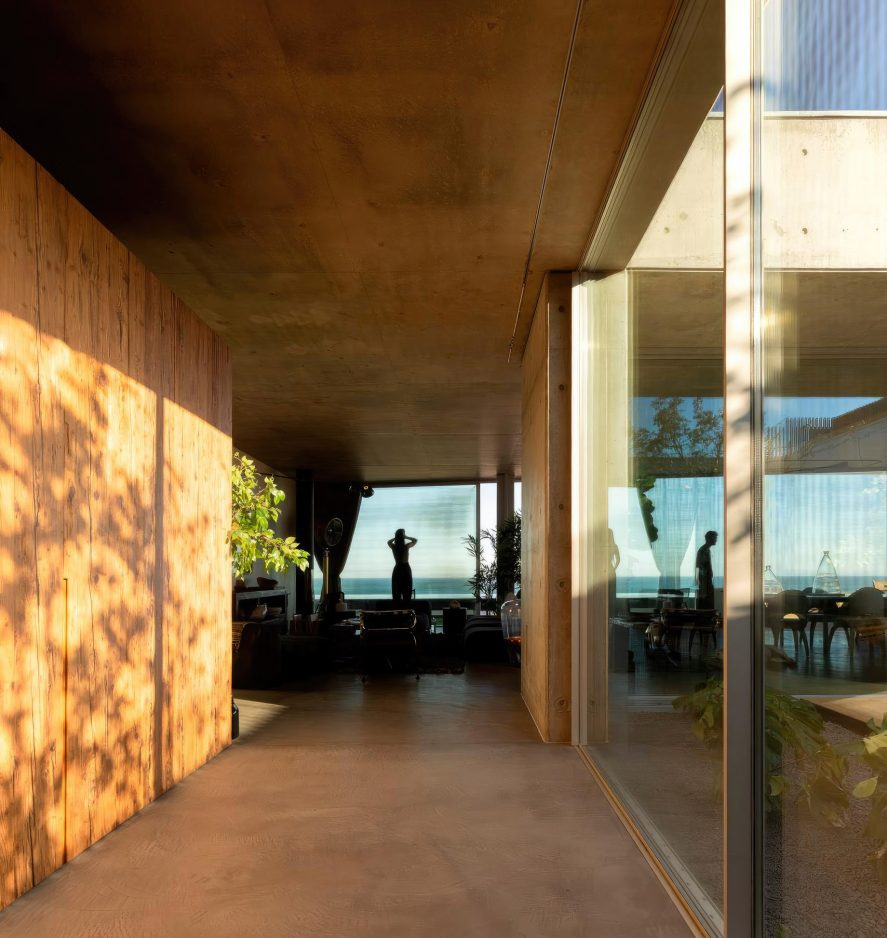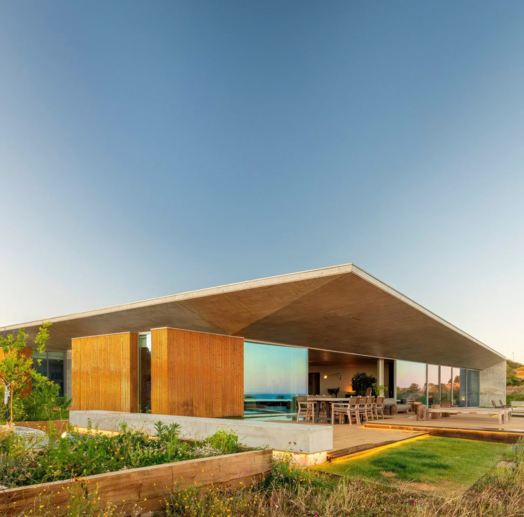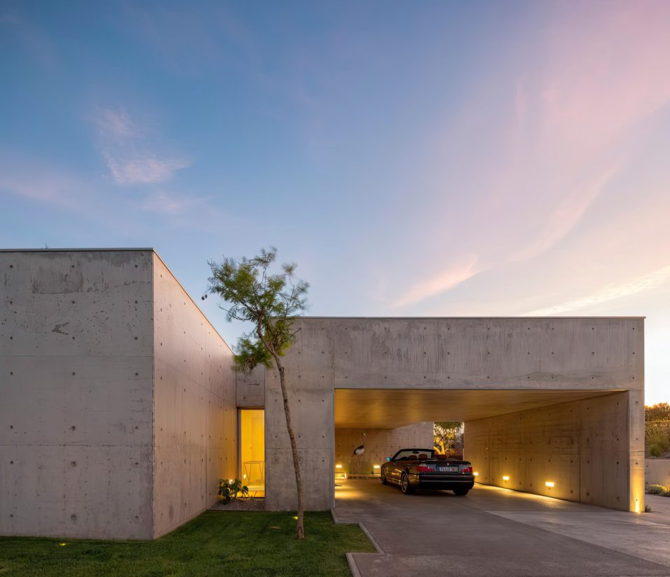 Libre House, by Mario Martins Atelier, was designed as a permanent residence, this single-story concrete home is organized around a central courtyard marked by a carob tree, with social spaces, kitchen and living, to the south and private bedrooms to the east. Its exposed concrete structure, raw and low maintenance by design, is punctuated by large, glazed surfaces that embrace sea views while remaining shielded from solar heat by a strikingly slim, cantilevered canopy. A long, linear swimming pool anchors the outdoor space, creating visual balance along the homeβs southern faΓ§ade.