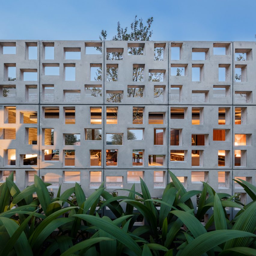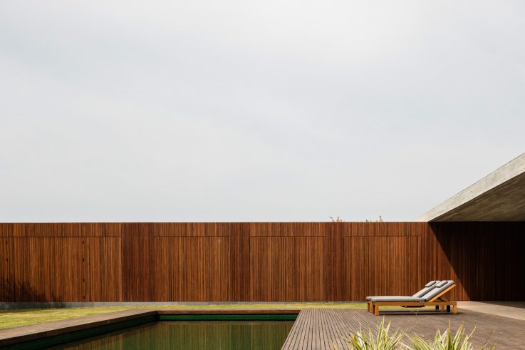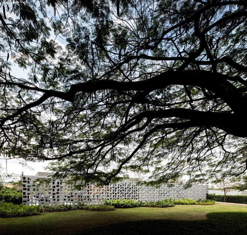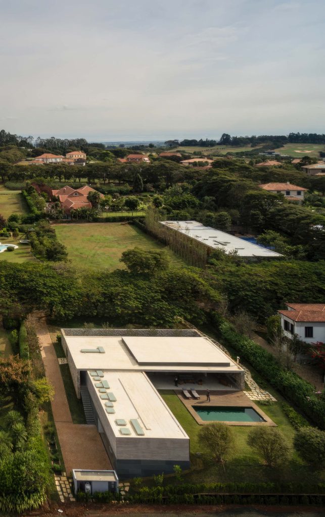 The Pasqua House, located in Fazenda da Boa Vista, Porto Feliz, exemplifies a thoughtful integration of architecture with its natural surroundings. The design, characterized by an “L” shaped layout, merges seamlessly with the landscape, creating a fluid connection between indoor and outdoor spaces. The house is composed of two main volumes, with the social and private areas distinctly separated yet connected through an open-plan kitchen. The use of concrete, stone, and wood as primary materials not only enhances the visual appeal but also contributes to the home’s environmental comfort. Notably, a 27-meter-long hollow brick wall made of precast concrete panels, painted white, serves as the projectโs signature element, offering privacy while allowing natural light to create dynamic patterns throughout the day.