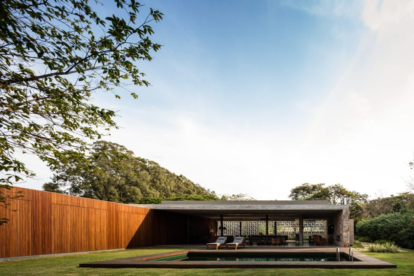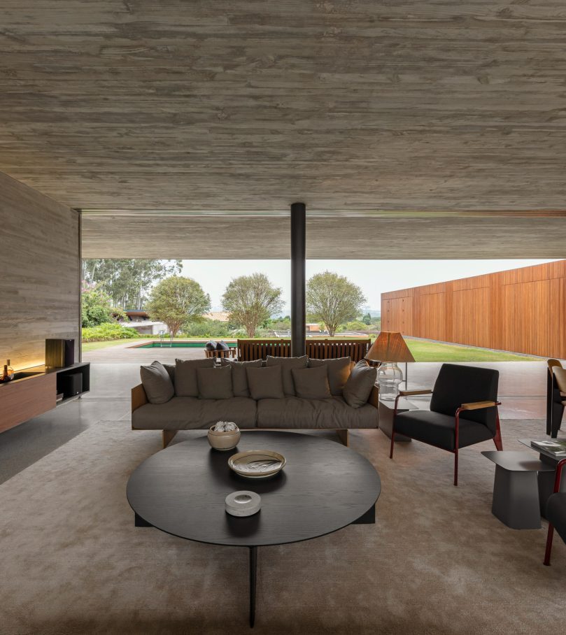 Pasqua House, by Studio MK27, located in Porto Feliz, combines modern design with natural elements. The single-story home is arranged in an “L” shape, promoting a seamless connection between the indoors and outdoors merging contemporary design with natural integration