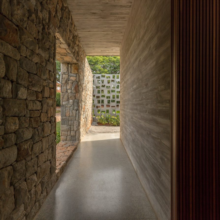 The design of the Pasqua House prioritizes the region’s climate, with strategies such as cross ventilation and extended concrete slabs to minimize the need for artificial cooling. Large glass panels enclose the living area, which, when opened, transform the space into a vast veranda, blurring the lines between the interior and the surrounding gardens. The choice of materials was carefully considered; local stone was used for the bearing walls, while wooden brise-soleil panels provide shade and maintain thermal comfort in the bedroom areas. The house’s layout allows for a harmonious flow between the social and private spaces, with the living areas opening onto a central garden and pool, fostering a sense of openness and connection with nature.