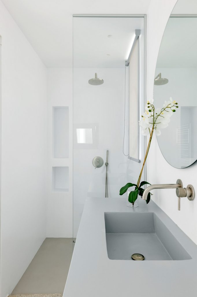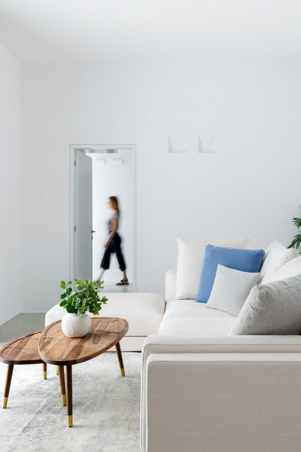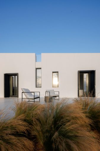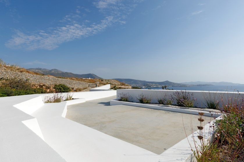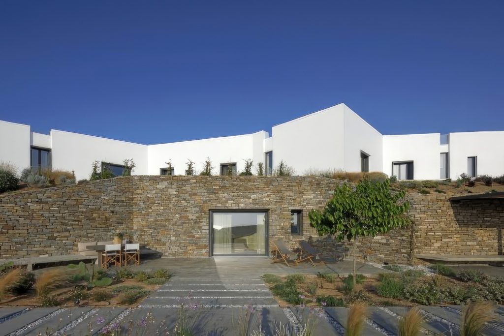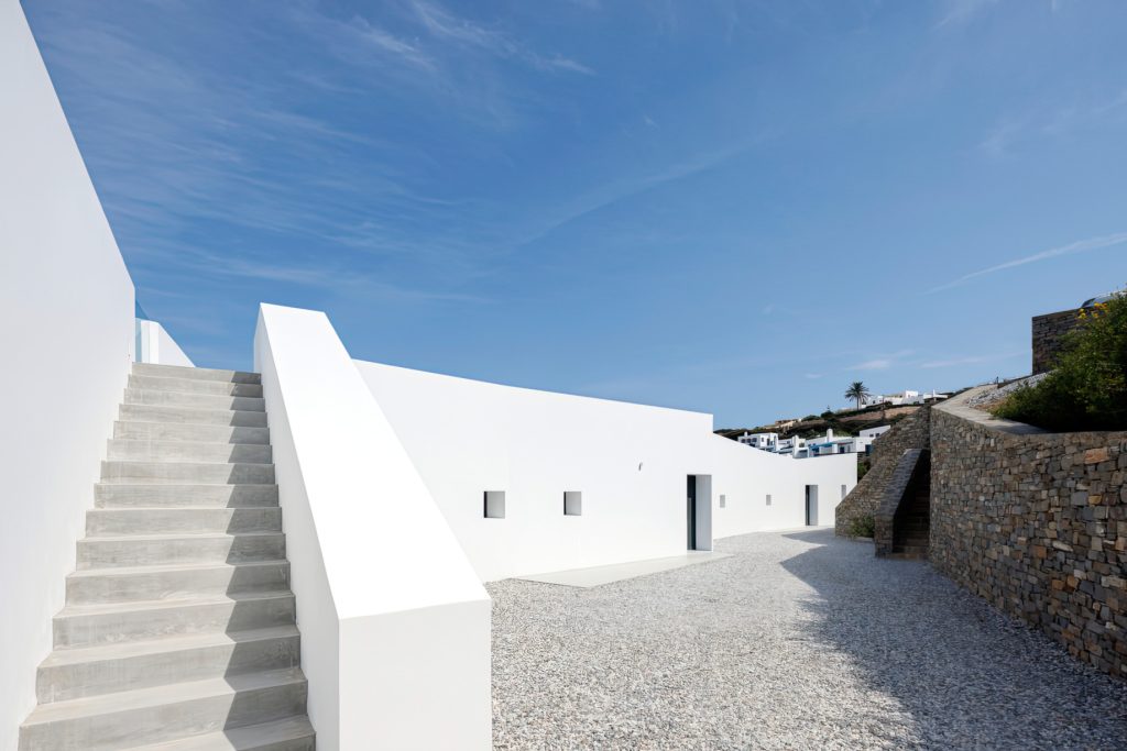 Rooted in Cycladic tradition, the residence fuses local materials with modern aesthetics to redefine the islandโs architectural language. The interplay of white walls and stone surfaces creates a dynamic visual contrast, highlighting the plasticity of the form. As sunlight shifts throughout the day, the building transforms, casting ever-changing shadows that add depth and character. Visitors entering from the highest point of the property are greeted by an impressive stone retaining wall, guiding them toward the planted roof and seating areas where they can fully appreciate the breathtaking views of the bay.