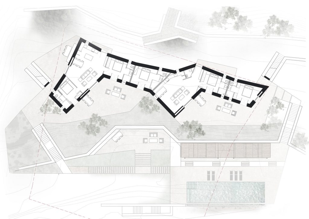 The architectural design emphasizes a seamless blend between the residences and their courtyards, enhancing the sense of openness while maintaining privacy between the units. The courtyards act as both functional and aesthetic extensions, creating multi-level outdoor spaces sheltered from the northern winds. Stone masonry plays a key role in bridging the steep slope of the plot, providing structure and function while adding a timeless element to the modern design. The long, narrow window openings on the facade are thoughtfully placed to invite light and views into the home while offering a rhythmic architectural balance.