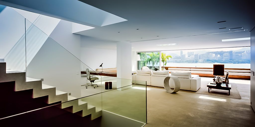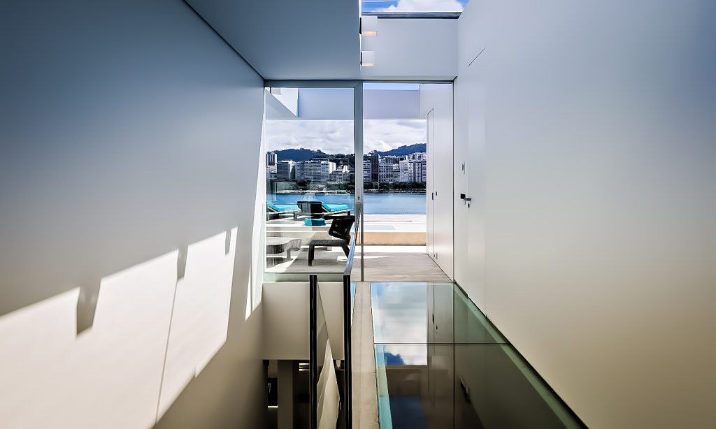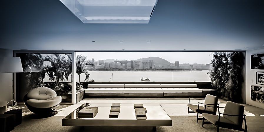 This modernist penthouse was designed with Brazilian culture in mind creating visual pathways of discovery for the natural beauty of Rio’s surrounding landscape on each side with an open architecture that filters natural light from the abundant city and mountain view corridors throughout the three-floor structure.