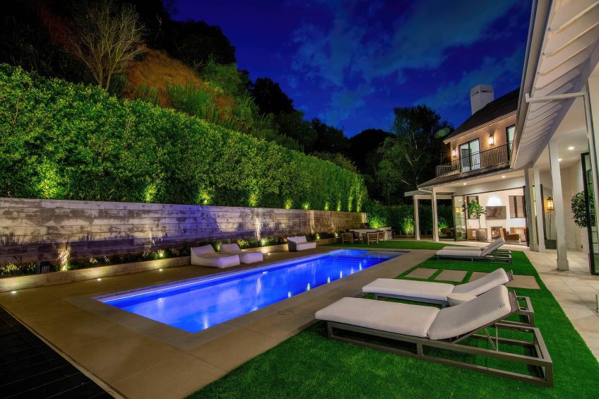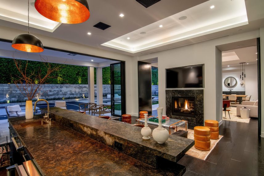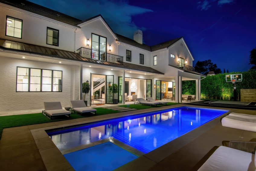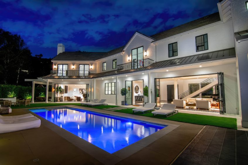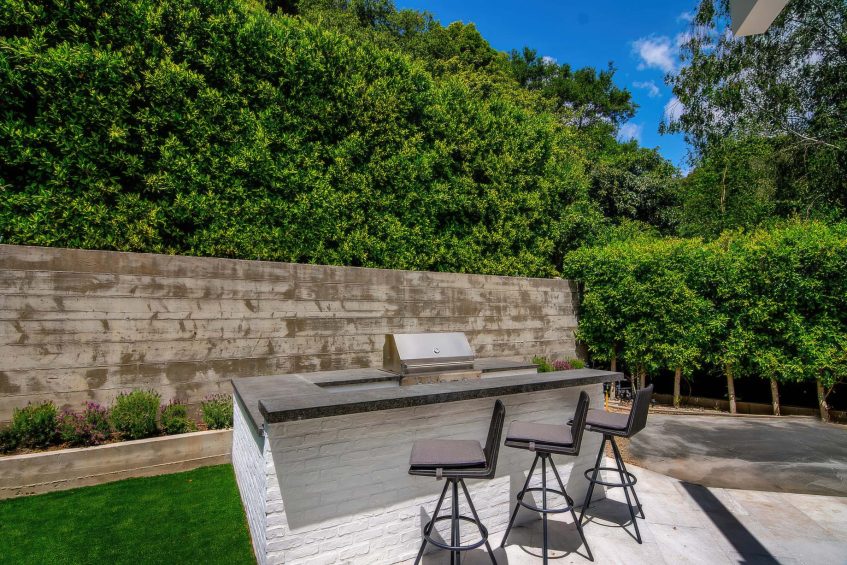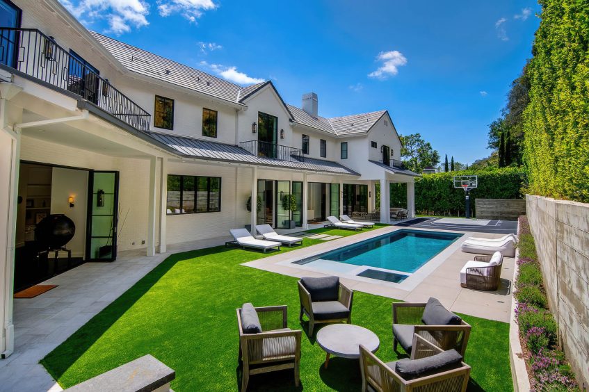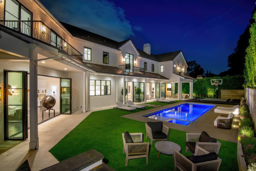 The residence was created to be an architectural masterpiece, reflecting a seamless blend of modern and farmhouse aesthetics, designed by Steve Wunderlich of 4C Design Group and realized by developer Justin Barth of Barth Partners with custom interiors by Hancock Design that add a refined touch to this Bel-Air change-maker. As a result, this estate at 1281 Stone Canyon Road is not just a home; it is a statement of luxurious living, offering a sanctuary of resort-style sophistication where every detail caters to comfort and entertainment.