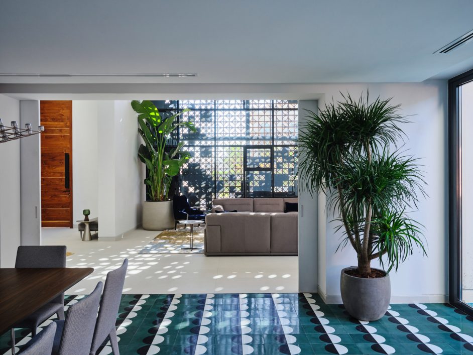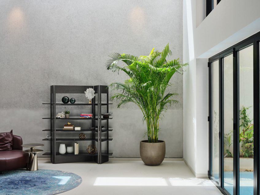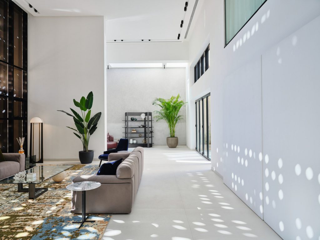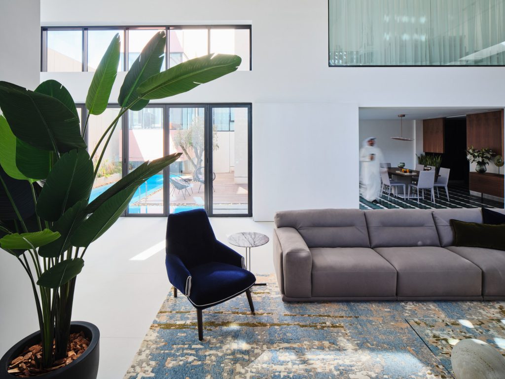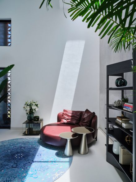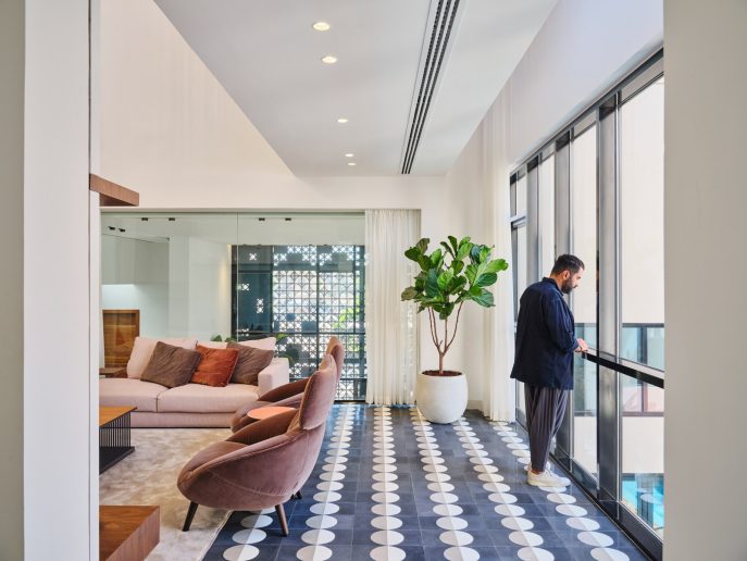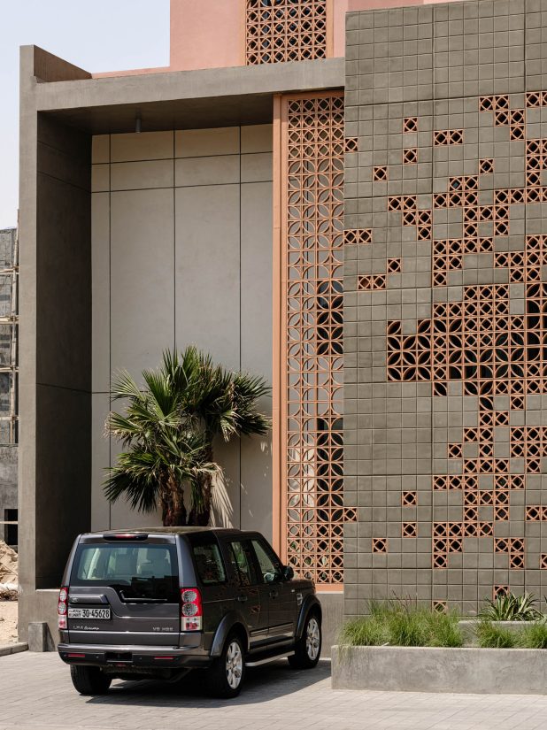 The residence, spanning three floors, showcases a split-level design that intertwines the different spaces within. The facade, standing 7 meters tall, boldly challenges the typical Kuwaiti residential architecture norms. Instead of a traditional fence, the facade itself serves as a barrier, blending solidity and porosity to ensure privacy while allowing natural light to flood the interior. The cobogó tiles, forming a patterned element wall, act as a dynamic transition between exterior and interior spaces, enhancing the visual appeal and depth of the villa’s structure. The earthy tones of the exterior draw from the desert landscape, with the design further enriched by a playful mix of Arabic and Mexican influences.